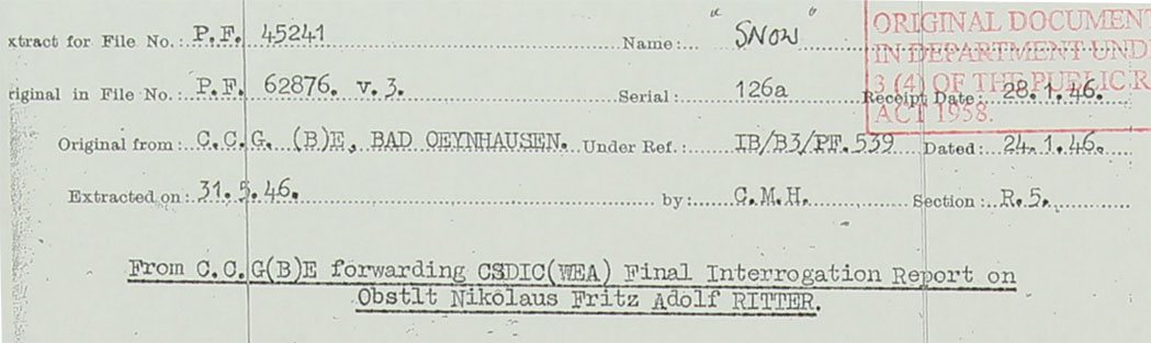 I (Major J.M.A. Gwyer) saw Ritter (now an Obst. instead of a Major in 1941) at CSDIC (Combiner Services Detailed Interrogation Centre) / WEA (Western European Army?) on Tuesday, 7th May (1946). The results of my interrogation will be incorporated in a full CSDIC report (PF 62876; KV 2/85 .. KV 2/88), which will, I hope, be reaching you presently. In the meantime, you mat like to have the general account of the results and of my own impressions of Ritter (foregoing in these series - called the Doctor). This may be summarised as follows: