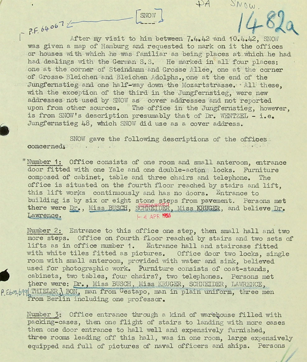 Ritter was, however, still in the mood of hoping that Snow would be able to provide explanation. He explained to me (Major J.M.A. Gwyer), rather naively, that by this time he (then Major Ritter) had already posted away from Hamburg (Ritter himself wanted to get away from the Abwehr job and as many men searched for a more active engagement; Ritter chose Rommel's DAK endeavours, in North Africa) and was no longer personally interested in the case to the same extent, but was, as he put it, "anxious to leave something behind him". I took this mean that he believed himself that the case was already blown, but was anxious, if possible, to postpone public recognition of this fact until he himself was safely in North Africa. (AOB, this fellow interrogator, did not possess an understanding what the mood of many Germans, in military Service were; these often young men wanted to become engaged in thrilling prosperous developments. Their only means was to apply for an active military employment. My just recently buried best friend Rudolf Staritz (3.9.2021 at an age of 99 at Ziegenrück) also applied for an active military engagement in stead of drawing schematics spy set schematics and/or regular W/T signalling between Stahnsdorf and, for instance, the station Sabine in Madrid. He was sent to espionage groups, known as: Unternehmen Dromedar and ended up in the Caucasus, in Autumn 1942; he, of course, suffered also from the big consequences after the Russian campaign initiated on 9 November 1942). He told me that he did not directly tax Snow (Arthur Owens) when he saw him with being under control, but that Snow must certainly be gathered from his manner that his suspicions had been aroused. His opinion of celery (Walter Dicketts, German cover name Mr. Brown) which derived from and was confirmed by both his own statements and those of Snow (Arthur Owens / Johnny), was that his status was that of a III F agent (section designation for the counter-espionage), who had been given the mission of penetrating Snow's (Arthur Owens') network (As Arthur Owens was born in Wales, be recruited mainly Welshmen, of whom almost all were in the hands of M.I.5)