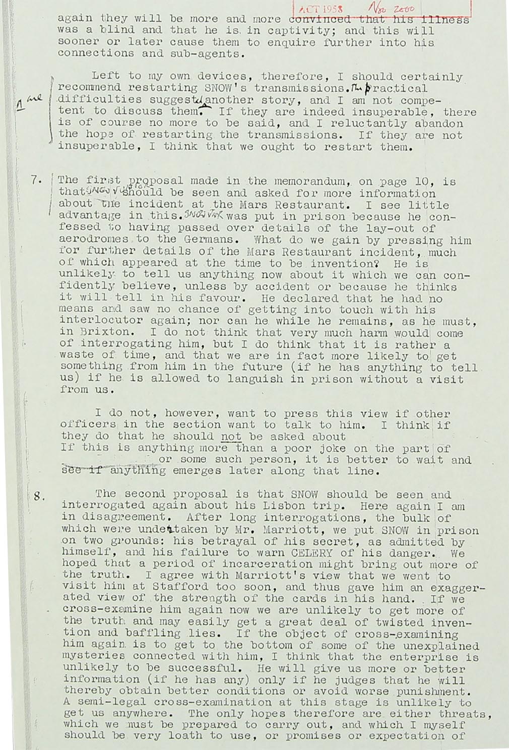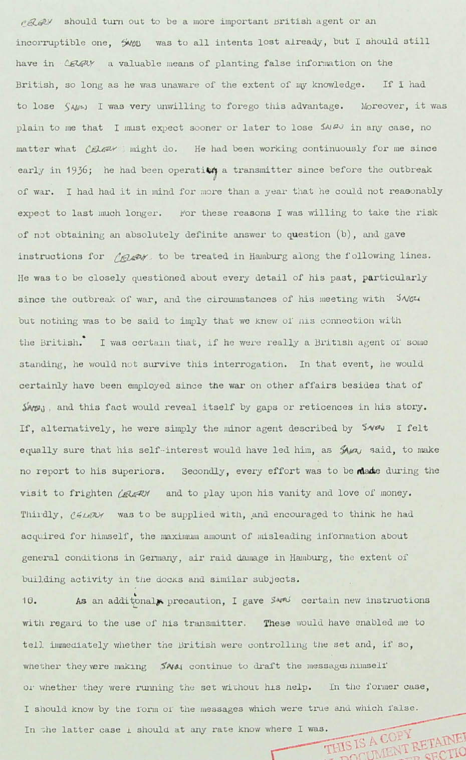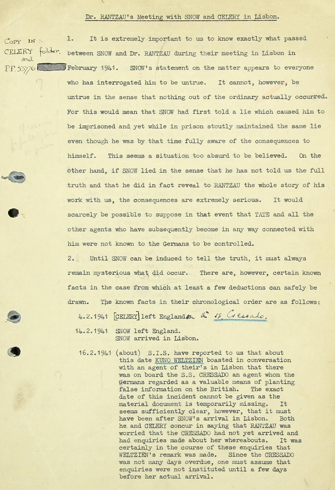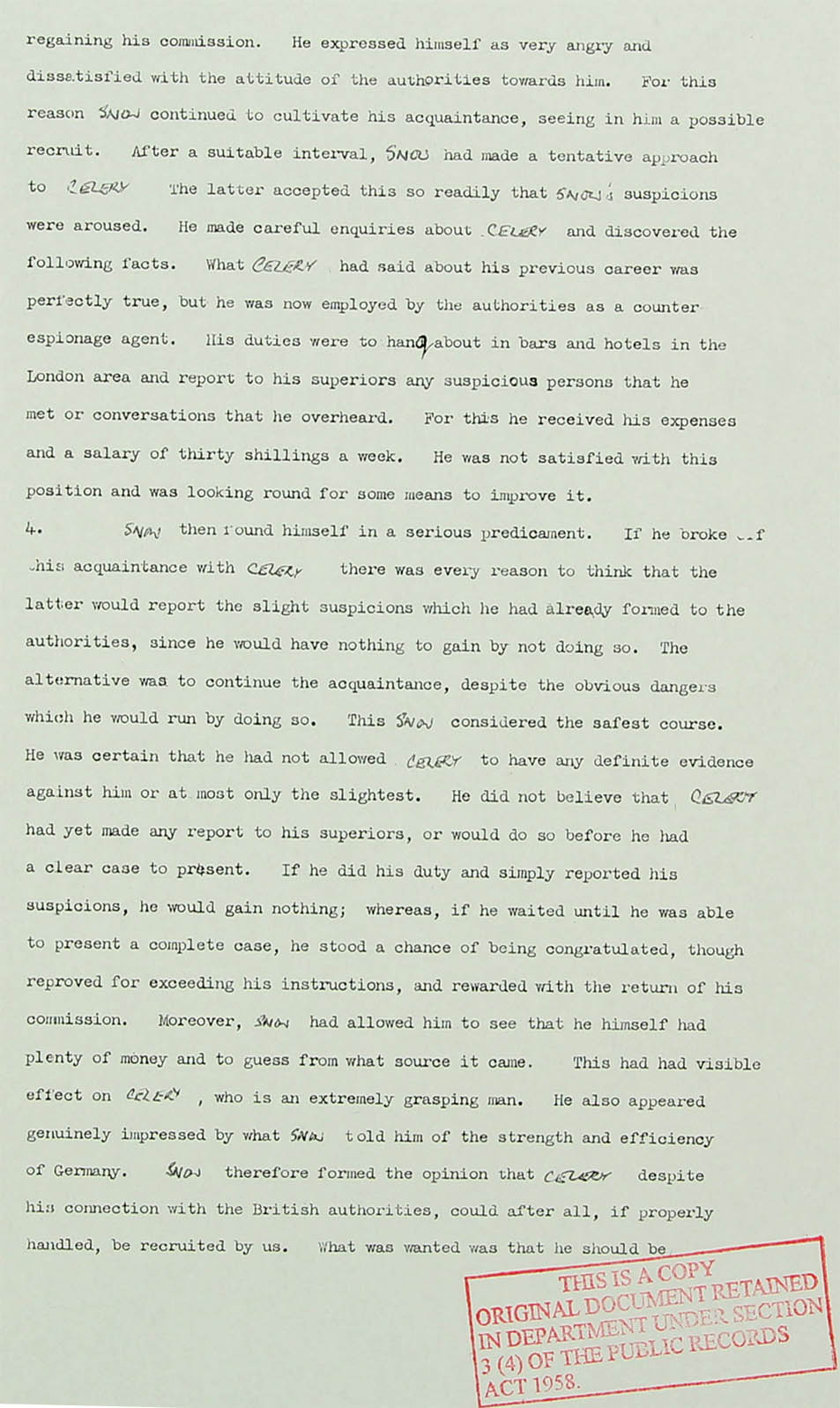 It was on this footing that Celery was allowed to rejoin Snow (Arthur Owens) in Lisbon, and the pair to return to England. At this point, however, Ritter made on interesting comment. he told me that he had sent back (more correctly: allowed to return to England, as they easily could have been kidnapped by the Germans, otherwise) Snow (Arthur Owens) and Celery (Walter Dicketts) to England with (as we already knew) instructions for operating a Triple Cross, and a sum of between £300 and £400 in cash. I challenged him on this last point, and suggested that it had in fact been £300 or £400 but £9000 or £10,000. At this Ritter showed the greatest surprise, and protested that he had never in his life given Snow (Johnny / Arthur Owens) even as much as £500 at one go. When I assured him that the pair had in fact returned to England with a much larger sum, he said that he could only suppose that the money had been → (page 5)