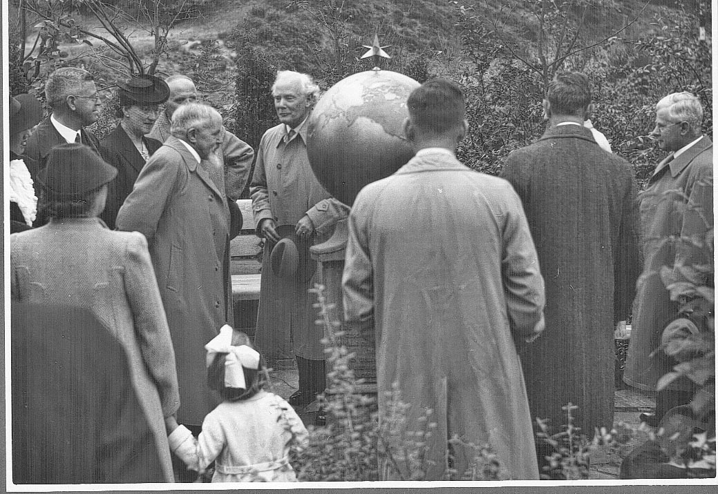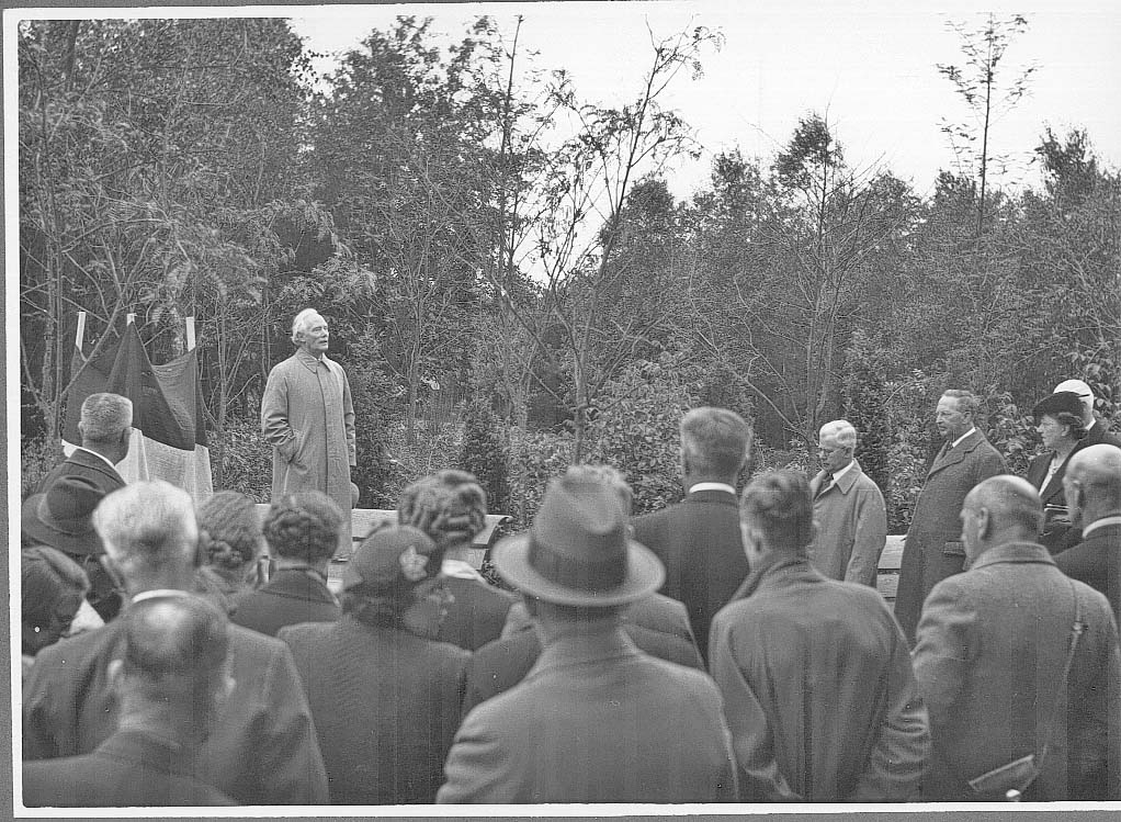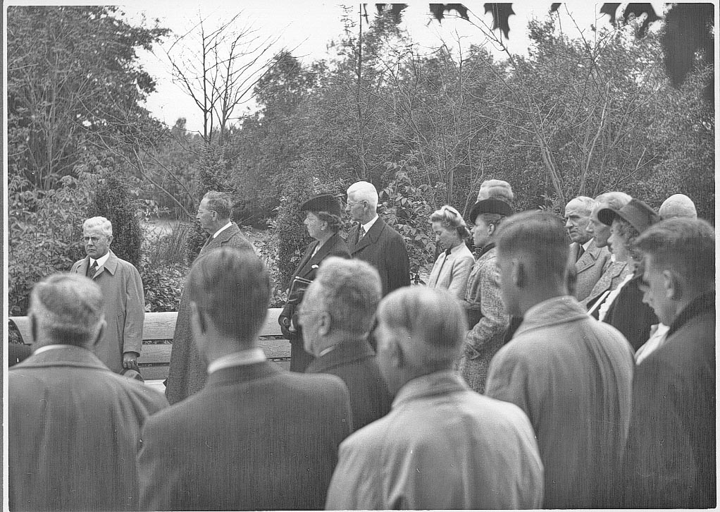 Bezichtiging van de gedenkkei; naast de Directeur Generaal de beeldhouwer Titus Leeser, die het inschrift verzorgde