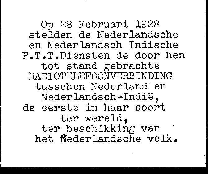 Op 28 Februari 1928 stelden de Nederlandsche en Nederlandsch Indische P.T.T. Diensten de door hen tot stand gebrachte RADIOTELEFOONVERBINDING tusschen Nederland en Nederlandsch-Indië, de eerste in haar soort ter wereld, ter beschikking van het Nederlandsche volk.