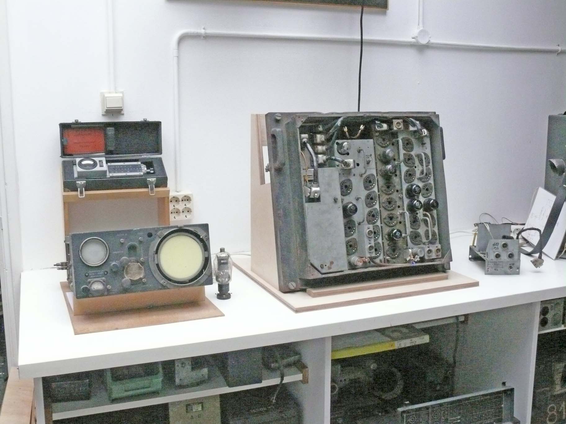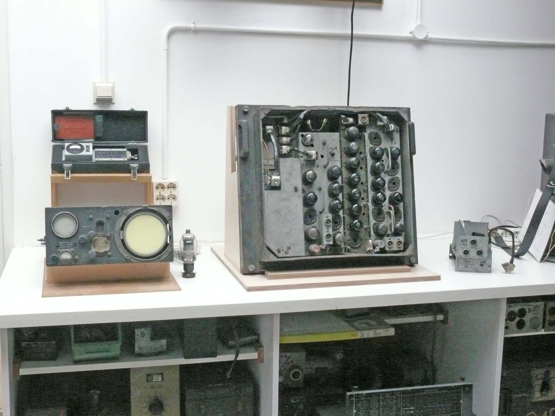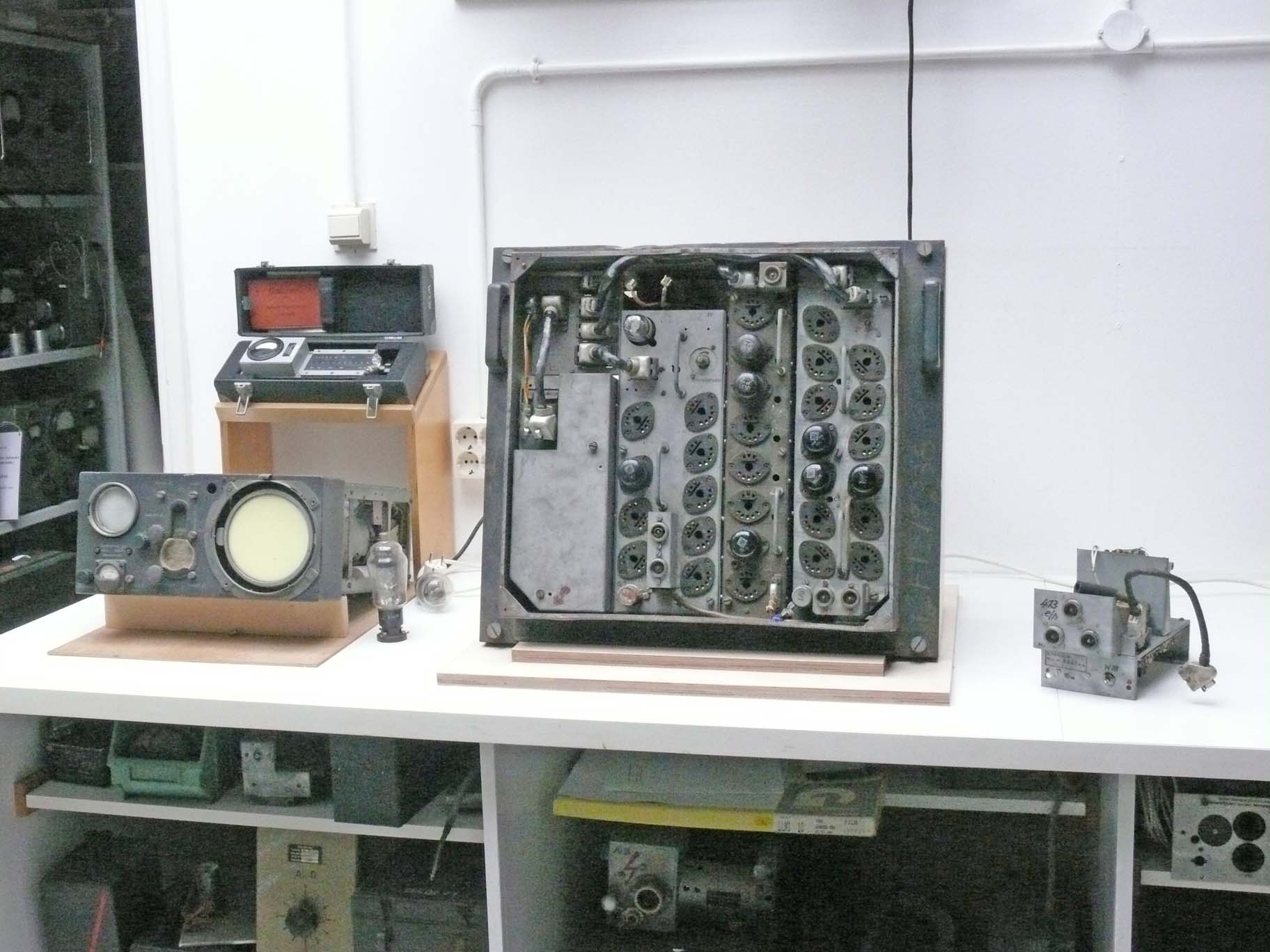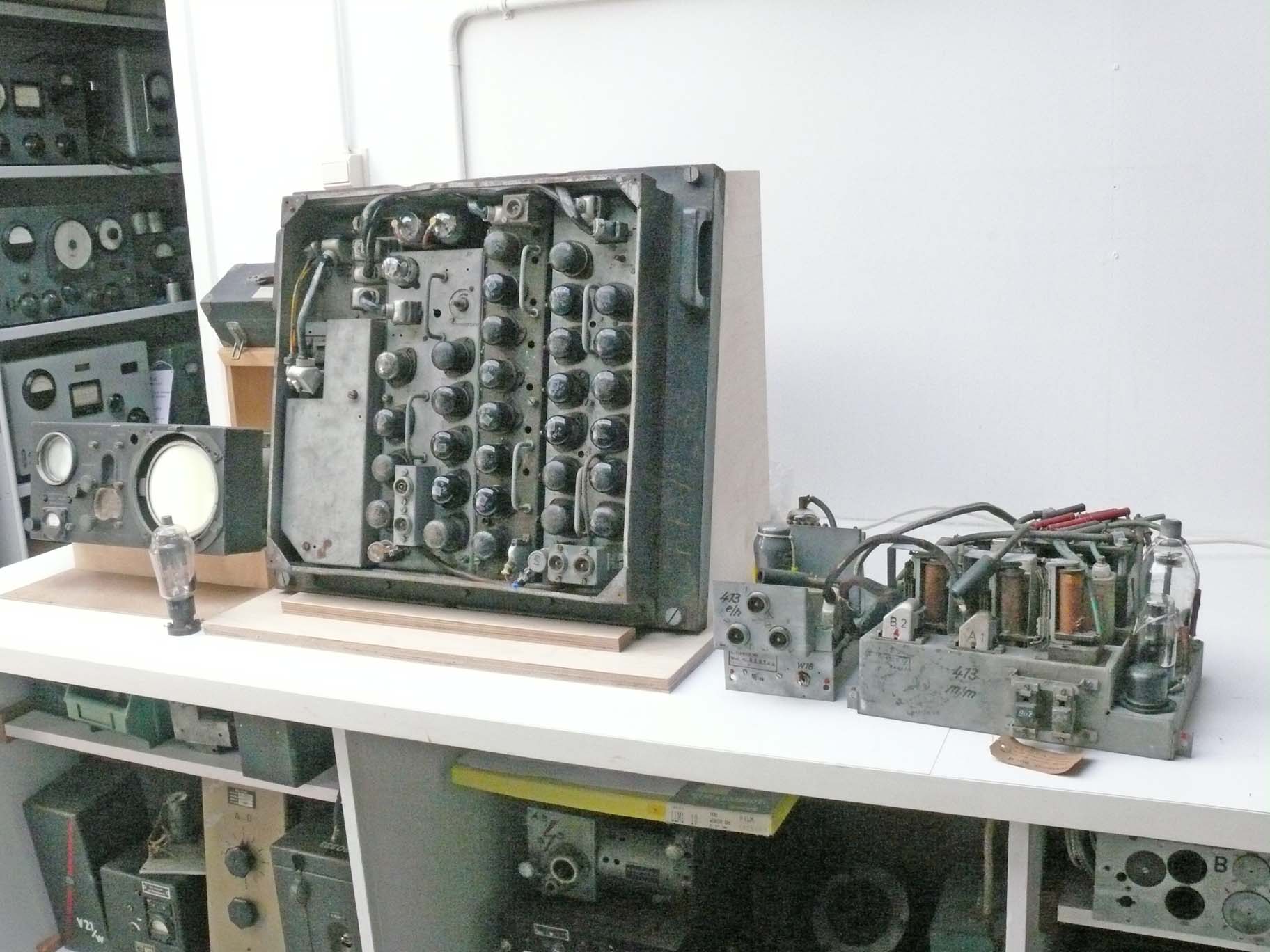 From left to right: front most left-hand side Berlin PPI unit (SG 224); behind it in front of the wall the genuine wave meter; in the centre Berlin Feld I; and on the far right-hand side a trigger module genuinely belonging to the Berlin transmitter Field II.