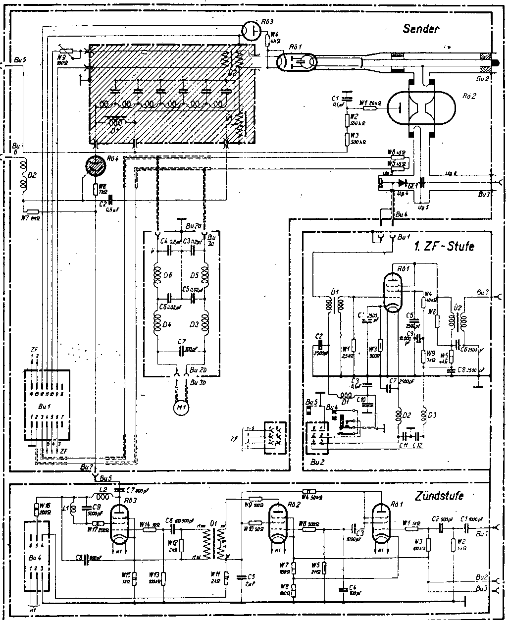 The shaded (hatched) box is filled with oil. The open-end delay-line consisting of series coils and tapping Cs to ground LzK1 (Laufzeitleitung) can be noticed in the foregoing photo on the top left-hand side, adjacent to it the circular device is a combined pulse step-up and filament transformer, which function was to keep the > 10 kV HT pulses from the regular 80 V 500 Hz power supply system.