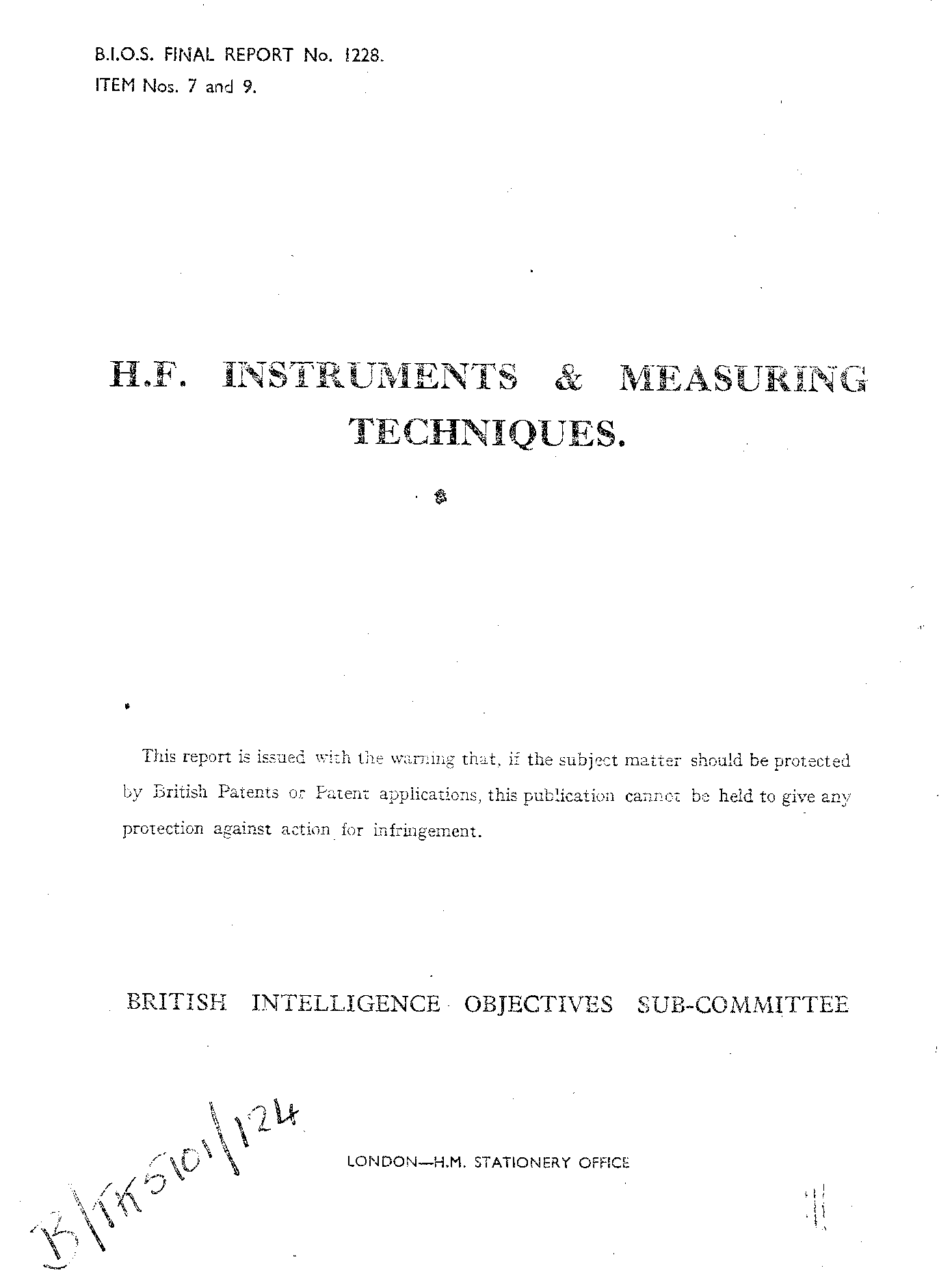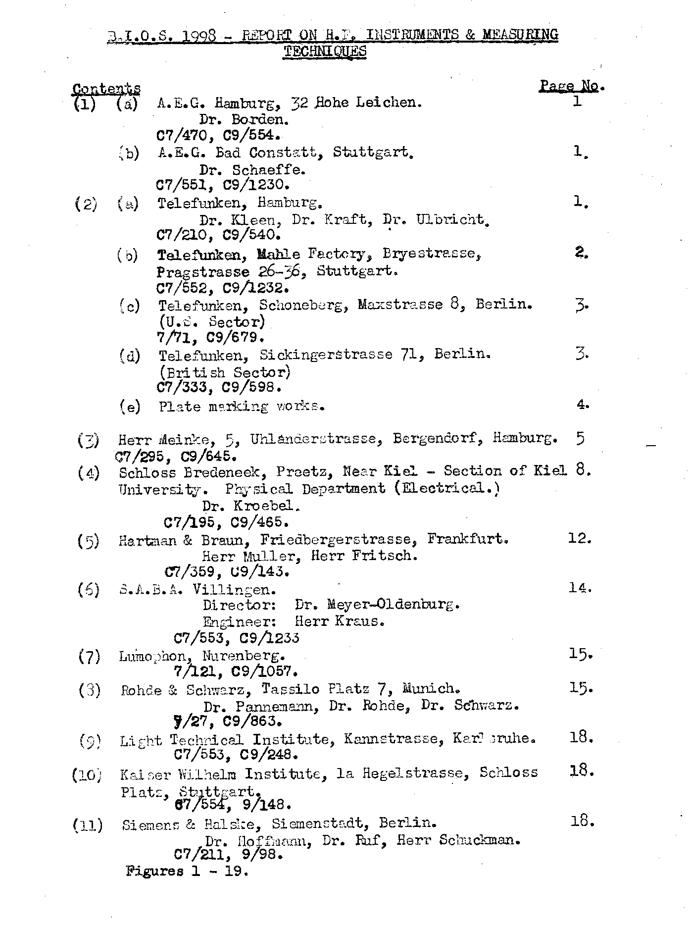 Keywords: AEG Hamburg; AEG Stuttgart; Telefunken Hamburg; Telefunken, Mahle Factory Bryestrasse, Pragstrasse 26-36; Telefunken Schöneberg Maxstrasse Bln; Telefunken Sickingerstrasse 71 Bln; Herr Meinke Uhlandstrasse 5, Bergedorf, Hamburg; Schloss Bredeneek Praetz, near Kiel University Physical Department (Electrical) Dr. Kroebel; Hartmann & Braun (H&B) Friedenbergerstrasse Frankfurt, Herr Müller, Herr Fritsch; SABA Villingen Director Dr. Meyer-Oldenburg Engineer Herr Kraus; Lumophon Nürnberg; Rohde & Schwarz Tassilo Platz 7 München; Light Technical Institute Kannstrasse Karlsruhe;; KWI Hegelstrasse 1a Schlossplatz Stuttgart; S&H Siemensstadt Bln dr. Hoffmann, Dr. Ruf, Herr Schuckman (Schuckmann?); Interview with Dr. Kleen an expert on valves, Rothe & Kleen his book is most important: quote This work appeared most important and it might be worth while translating it and publishing.; Dr. Meinke .. ; Dr. Kraft; Dr. Gunthe Wolf (Günther Wolff??); Dr. Kotowski; Dr. Buschbeck; Dr. Bruck (Brück?); Dr. Steiner (Dr. Steimel??); Herr Spiegel; Dr. Ulbricht; Herr Maas (Maass??); An interesting calibration device for calibrating transmitters automatically was described. The method was a photographic one .... page 3!!! ... when a beat note was heard ... Like AS60 - E52 and related microfilm scales!!!; Dr. Max Weth; Dr. Paul Wolf (Wolff?); bolometers; Rotating Standing Wave Indicator was adapted to 10 cms and to 3 cms .. ; Dr. Kroebel; Panoramic Receiver .. ; Hartmann & Braun .. ; quoting: obviously reluctant to divulge all his latest designs and admitted that he was holding these back until he could once again market them as a business proosition. Since this firm is in the U.S. zone and the American authorities tend rather to complain that investigation teams are upsetting production, little could be done to go more deeply into that latest developments of the factory. It is suggested, however, that such an investigation should be carried out with any compulsory powers that might be necessary; Quartz clock CFQ ... ; Siemens & Halske Dr. Hoffmann, Dr. Thilo, Dr. Kuhlman (Kuhlmann?); A series of cavity meters consisting of 6 silver plates screwed together and a very fine calibrated screw thread for the plunger (like Rel mse 2032a Frequenzmesser), Schüller AEG
