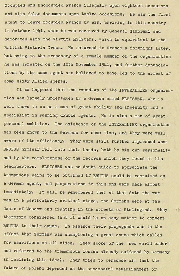 It so happened that the round-up of the Interalliée organisation was largely undertaken by a German named Bleicher, who is well know to us as a man of great ability and ingenuity and a specialist in running double agents. He is also a man of great personal ambition. The existence of the Interalliée organisation had been known to the Germans for some time, and they were well aware of its efficiency. They were still further impressed when Brutus himself fell into their hands, both by his own personality and by the completeness of the records which they found at his headquarters. Bleicher was no doubt quick to appreciate the tremendous gains to be obtained if Brutus (Walenty) could be recruited as a German agent, and preparations to this end were made almost immediately (AOB: from this point might, in some way or another, originate the cover-name Brutus!). It will be remembered that at that date the war was in a particularly critical stage, the Germans were at the doors of Moscow and fighting in the streets of Stalingrad (AOB, here we may conclude that Mr. Astor is a dilatant! Stalingrad was reached by the Germans about the end of August 1942, and the story reproduced was somewhere early 1942; what might have been the case: is, that he noticed the time that the German agent Walenty then name by the latter Hubert) They therefore considered that it would be an easy matter to convert Brutus (Hubert) to their cause. In essence their propaganda was to the effect that Germany was championing a great cause which called for sacrifices on all sides. They spoke of the "new world order" and referred to the tremendous losses already suffered by Germany in realising this ideal. They tried to persuade him that the future of Poland depended on the successful establishment of → (page 69)