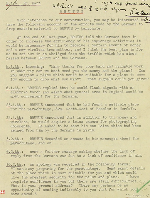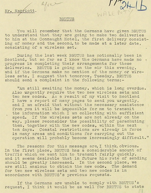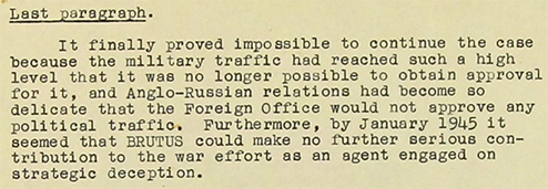 It finally proved impossible to continue the case because the military traffic had reached such a high level that it was no longer possible to obtain approval for it, and Anglo-Russian relations had become so delicate that the Foreign Office would not improve any political traffic. Furthermore, by January 1945 it seemed that Brutus could make no further serious contribution to the war efforts as an agent engaged on strategic deception.