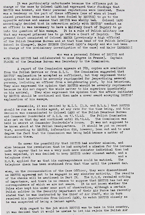 → he arrived in this country (England) in the same month, and was obviously in a very nervous condition. He was closely interrogated by both Polish and British security authorities, but was careful to avoid any reference to his recruitment by the Abwehr, as he was was very conscious of his of his responsibilities towards friends in German hands and was not yet certain of the degree to which the Germans penetrated the Polish H.Q. in London. He did, however, mention to the Chief of Polish Security Service that he would have an interesting statement to make in a month's time/ He duly satisfied the investigating authorities that his escape had been genuine (which wasn't) (D70) (D70return), but on the 20th November Brutus produced a document headed "Le Grand Jeu", in which he made a full confession of his recruitment by the Abwehr and produced some wireless crystals which he had kept hidden in the heels of his shoes. He revealed that his mission was primarily of a political nature, designed to foster discontent → (page 70)