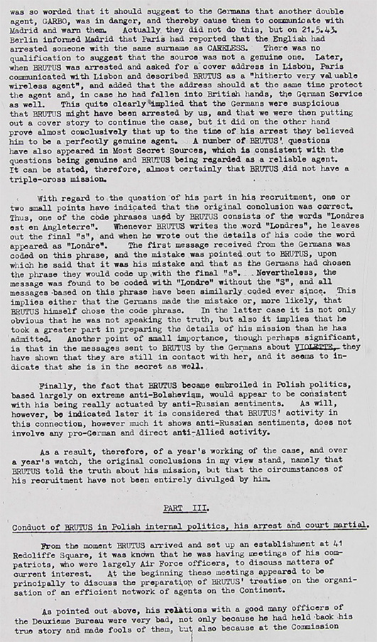 I cannot help feeling that Brutus is showing insufficient interest in military developments in France. It is true that he has told the Germans that he would obstinately refuse to be influenced by Allied propaganda and that he has recently (before 28 August '44) received an assurance from the Germans that they still have complete confidence in the military operations planned by them. Now, however, it is no longer possible for Brutus to believe in a German military victory in the west. This is not merely because of the optimism proclaimed by the press, but because he is known to be in contact with (Polish) senior Staff officers, who would leave him in no doubt as to the true state of the German 7th Army. Brutus must therefore suppose that the Germans are playing for a political victory in the west and a military in the east - a solution which Brutus himself suggested to the Germans some months ago. Granted this, Brutus would realise that no matter how assiduously (diligently) he works for the Germans , he cannot prevent the Allies from liberating western Europe, and there would therefore only remain one reason for which Brutus would continue to risk his life working from England instead of of returning to (Russian controlled) Poland, where he could continue to fight with some chance of success for the ideals which he has always pronounced dear to him.