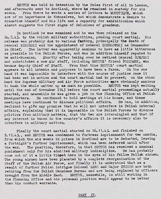 Thereafter Brutus was allowed to lead a free normal life in England, the only outstanding high-light being his arrest in June of 1943, when it was discovered by the Polish authorities that Brutus (Hubert) was playing a leading part in Polish political affairs, and in particular had been responsible for cyclostyling a pamphlet attacking General Ujewski, who then held a position as ??? Brutus was duly tried by court martial and imprisoned for a week, when the remainder of his sentence was indefinitely postponed. Brutus's action in attacking Ujewski had the support of many rational Poles, including (not known details - or - being deleted in the context of censorship?) and time has shown that Brutus was in fact acting in the best interest of his country.