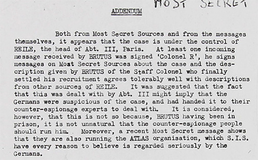 The Germans were well satisfied with the result of their propaganda and were evidently convinced of Brutus's (Hubert's) genuine desire to cooperate with them. As a safeguard, however, they pointed out the Brutus (Hubert) that both his mother and his brother were in German hands, as were also large numbers of the Interalliée organisation, and they (Obst. Reile, at Hotel Lutetia, in Paris) in made Brutus (Hubert) (actually Czerniawski) sign an undertaking that if ever he should double-cross them they were at liberty to execute these hostages.
