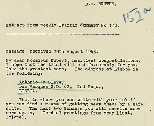With further reference to the Zigzag-Brutus (Hubert) tie-up, you may be interested in the following message which was received by Brutus W/T on 21.9.44"-