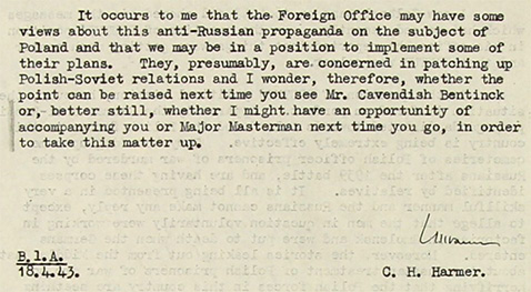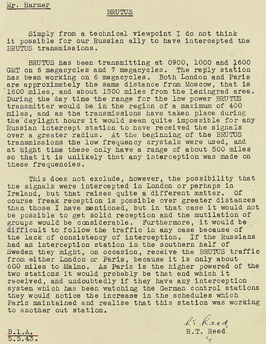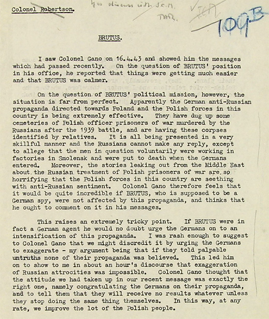 I have discussed this verbally with Colonel Fleetwood Hesketh, and he agrees that some sort of comment is urgently required from Brutus, but I can foresee to me, however, that Brutus can still of considerable value to Shaef, and as we are frequently prepared to fight his last battle on reasonable that we should be prepared to fight the battle on the highest level of the military hierarchy, it seems reasonable that we should be prepared to dig our toes in and fight the same battle in the diplomatic world. Whenever the Foreign Office approving authority is confronted with an item of traffic which throws a somewhat adverse light upon our Russian allies, he expressed a twofold fear (a) that the Prime Minister (Churchill) may get to hear about it, and (b) that the Russians might get to hear it (too).