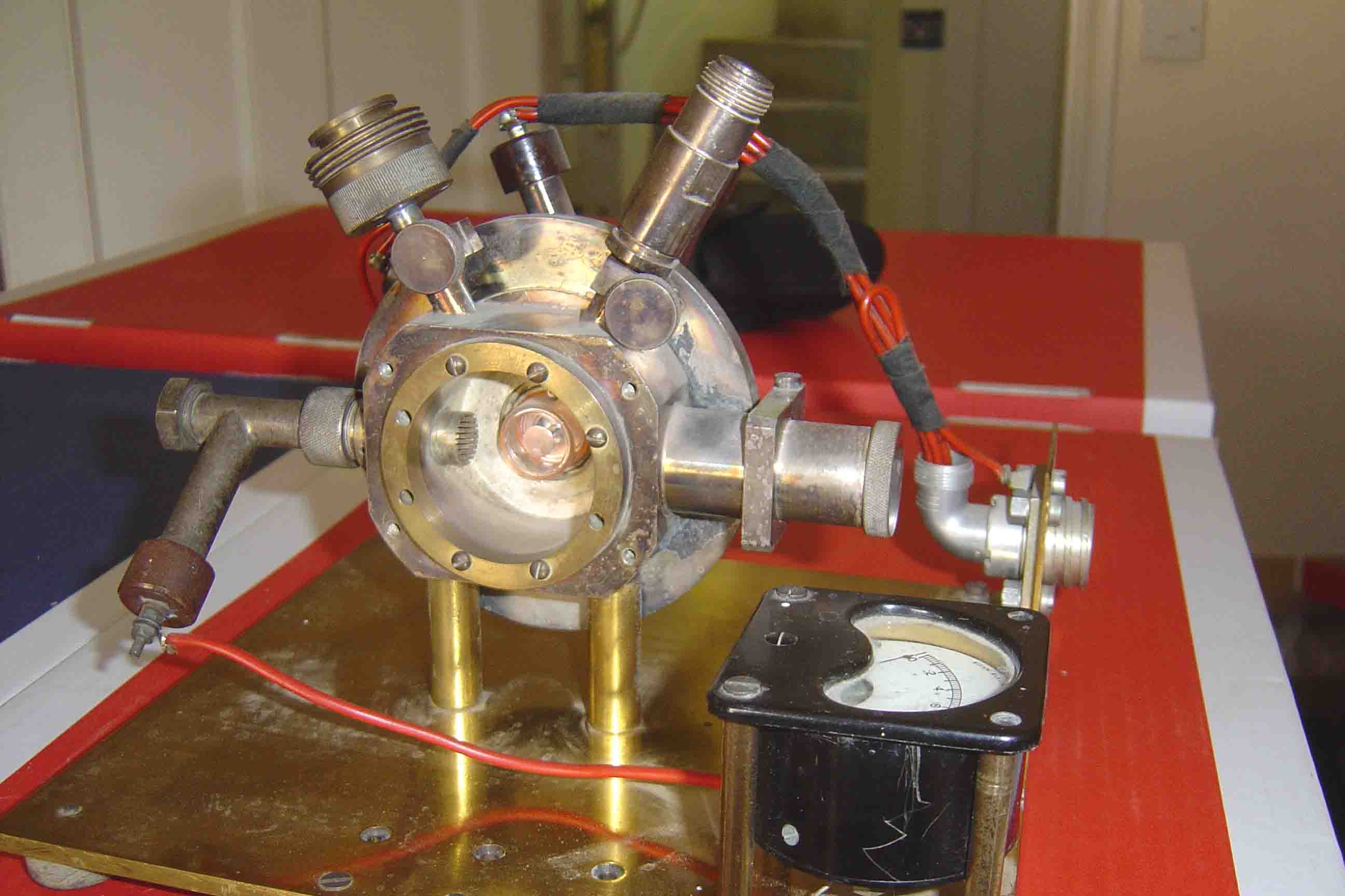 Side view of the test equipment. The circular section pointing towards us, might hold a rectifier diode. Right of it, in a more dark colour, is the magnet to the "Heil tube generator" (see next photo). Richard Trim kindly add to our discussions: Rod, The permanent magnet was used to focus the transverse electron beam in the Heil Tube.