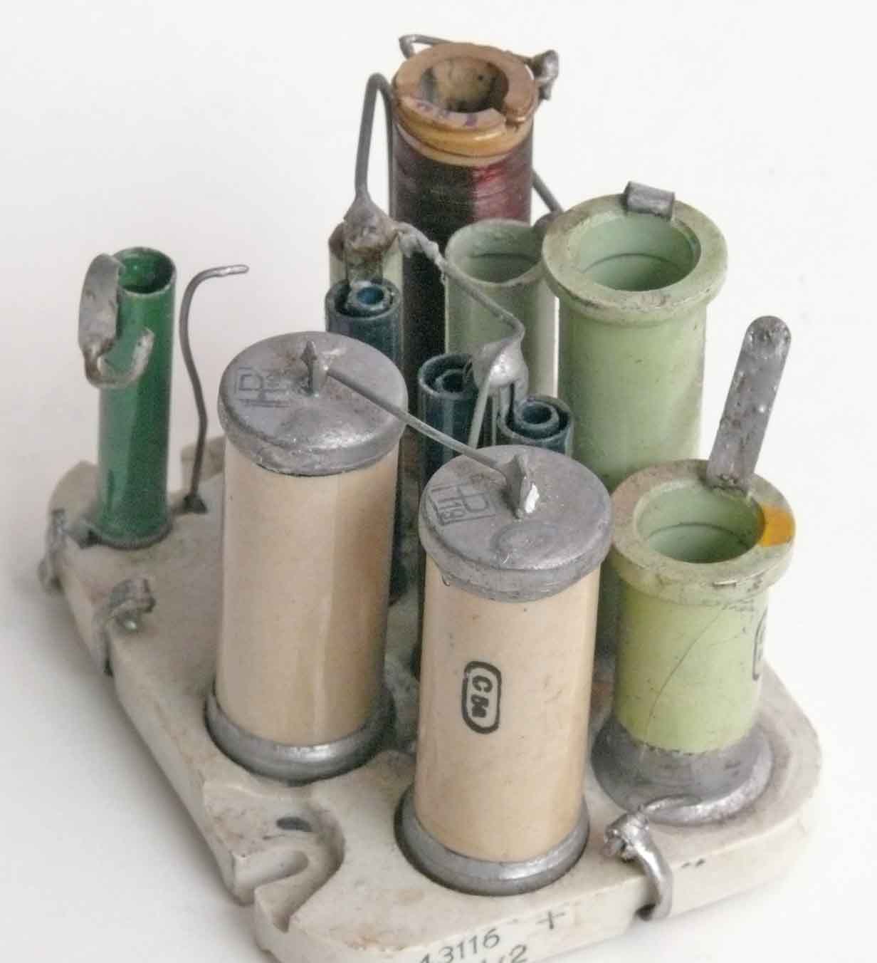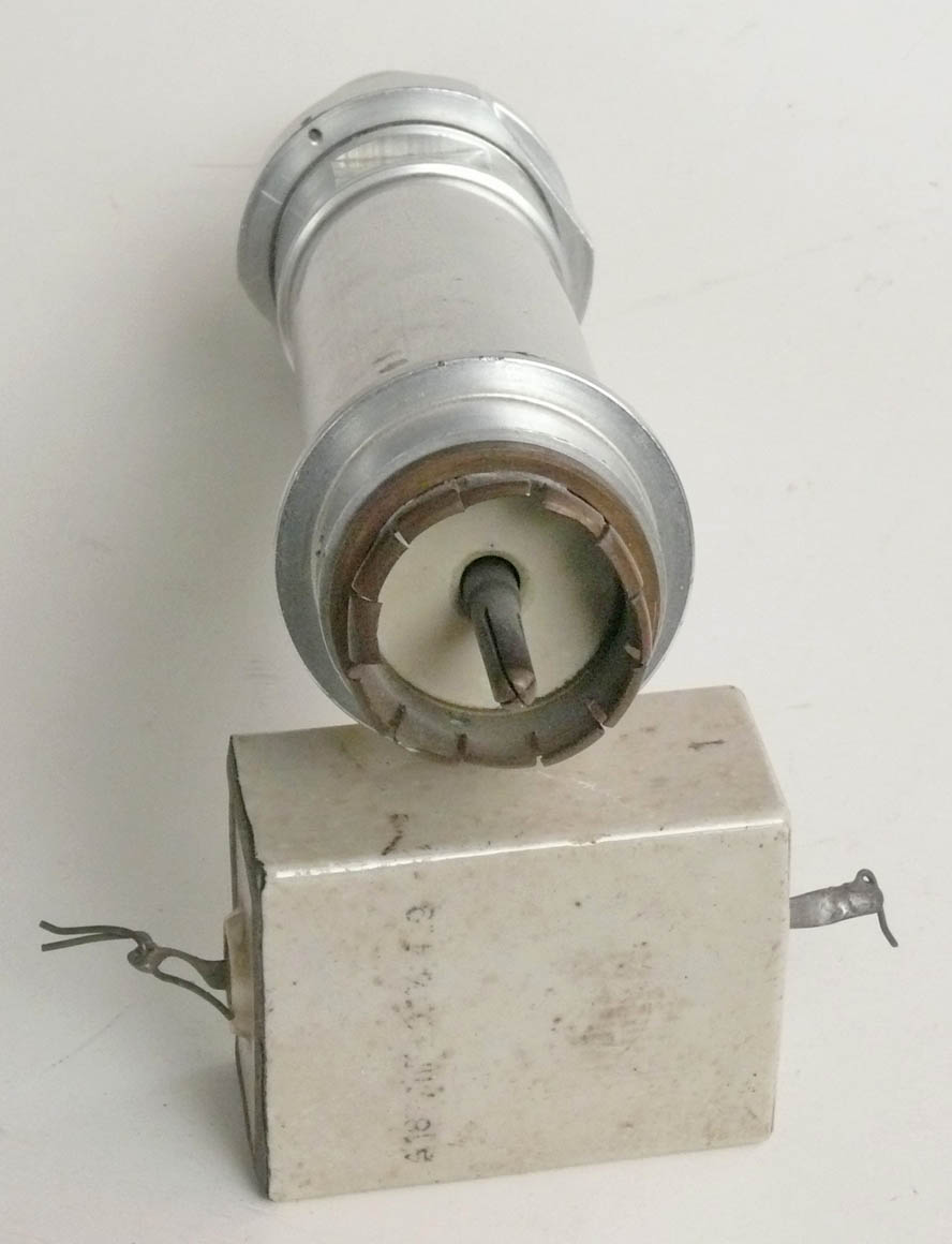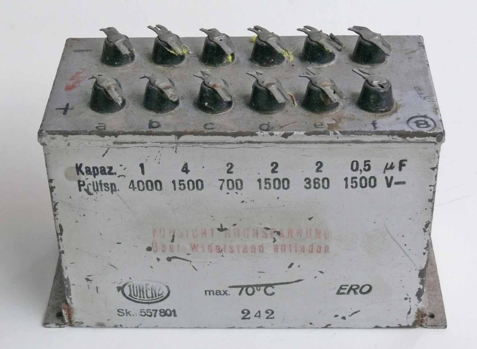 On the right the high quality version, where the capacitor a thoroughly screened off from environment by means of ceramic/soldering technique. Expensive, but even after say 70 years performing as if it is a new device. However, the left one is the quality standard of about early 1943 onwards. Far more simple and thus cheaper to be manufactured. The type, like the American and maybe British ones, they are not entirely sealed off from environment; suffering from hydroscopic effects. They often are causing circuit failures.