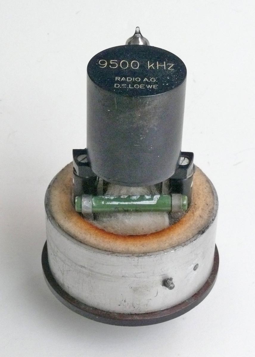 This might indicate that it might have been before 1938. Loewe was already engaged in quartz crystal manufacture from about mid 1920s onwards. I guess that it was meant for the use in a shortwave transmitter. The green resistor is heating up the system. Notice also the glass-wool application.