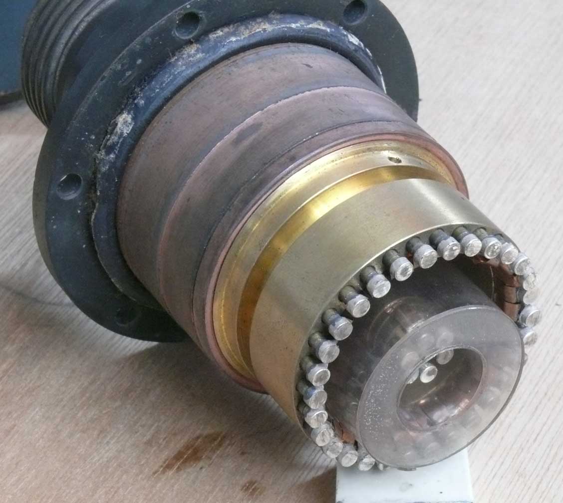 It is clear that much effort is put in ensuring proper HF contact. It is also evident, that it is not meant for constant rotation as there is no provision for it, however, there must be roll bearings somewhere inside; though not visible. I guess, that it was used as to facilitate antenna azimuth bearing or elevation. In the centre we see a transparent plastic tube, probably preventing HT arcs. This might indicate that high power could have been involved.
