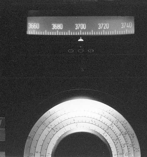 Up is visible the typical frequency scale projection of a Köln receiver type E52... , accomplished by means of a microfilm deposited on a glass disc, which had been achieved by an apparatus described above.
