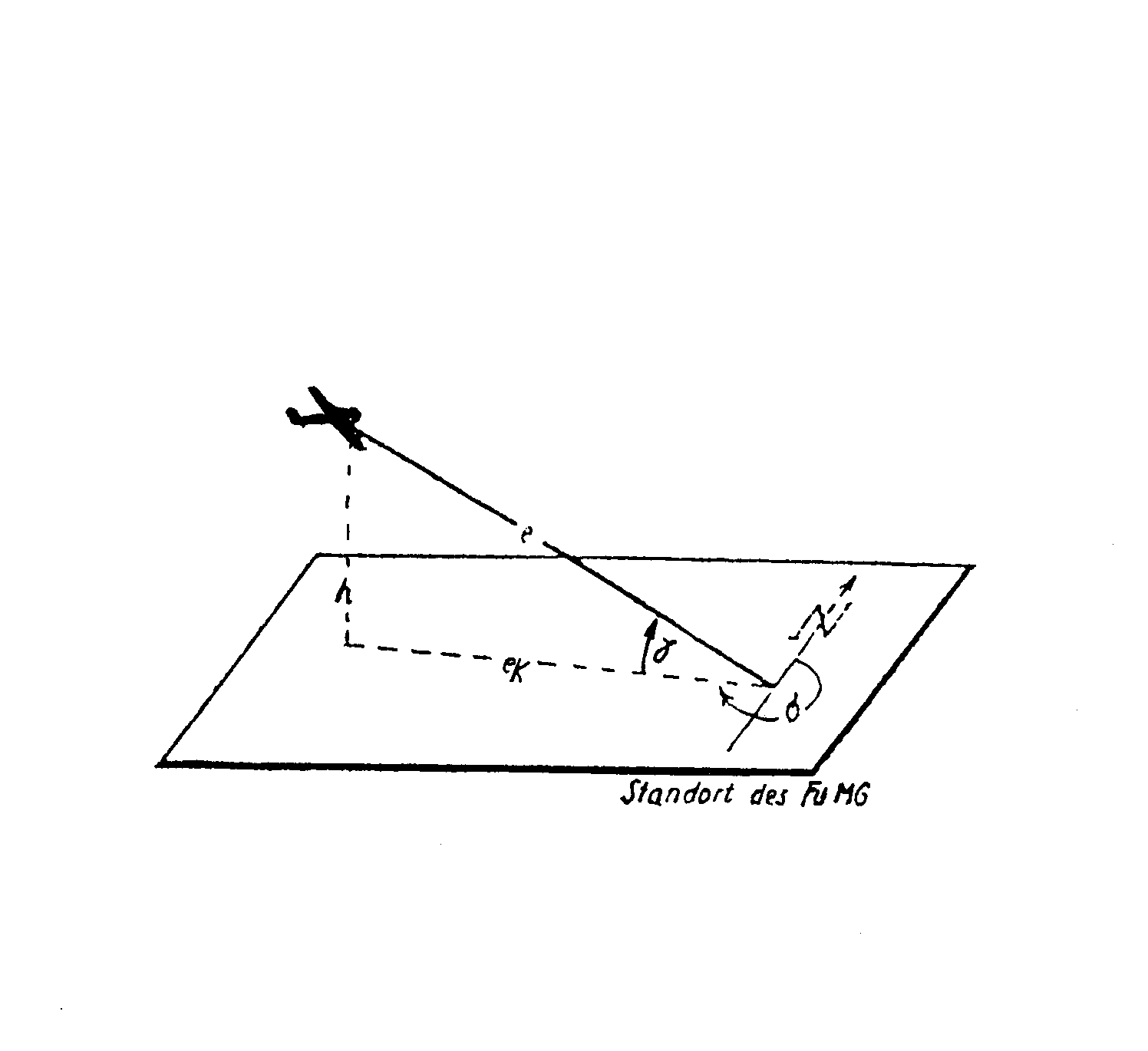The value of 'e' is called, in modern terms, slant range. Constituting the distance towards the target. The value of 'e k' means the target distance projected on a map, between radar set and its virtual position at the map. When the elevation angle γ (gamma) is 0 degrees, the map projection of the target equals the one read-off the radar screen. When γ is becoming 90 degrees, the map distance is, logically, 0 m. k stands for: Karte (map) e for Entfernung (distance)