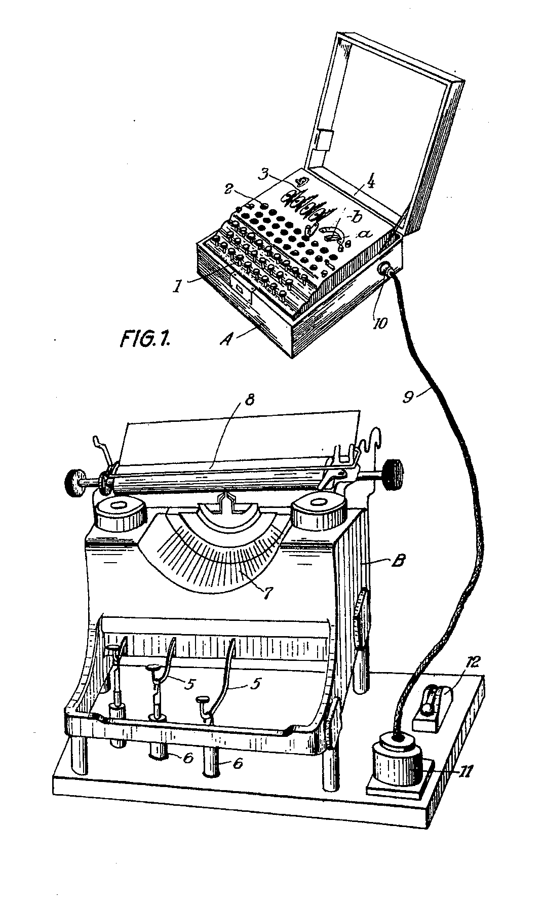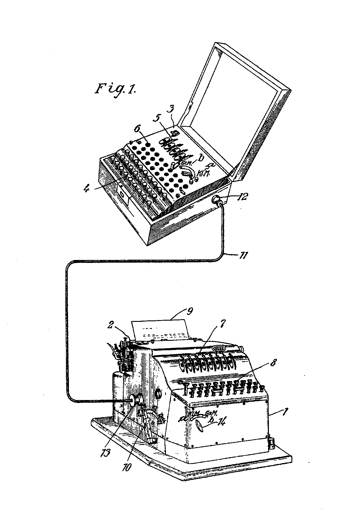 DE536556 Elektrische Chiffriermaschine mit Schreibvorrichtung; Application date 22 June 1929, granted 24 October 1931; Applicant: Chiffriermaschinen Akt.-Ges. in Berlin. Inventor: Willi Korn in Berlin-Friedenau; 1. claim: Elektrische Chiffriermaschine mit Schreibvorrichtung, dadurch gekennzeichnet, daß eine schreibende Chiffriermaschine (1) und eine weiteres Chiffriergerät (3) elektrisch gekuppelt und mit Schaltern und Verbindungsleitungen versehen sind, welche die Chiffriervorrichtung (7) der schreibenden Chiffriermaschine (1) abschalten und die Schreibvorrichtung (2) dieser Chiffriermaschine bei Bedienung des damit gekuppelten Chiffriergerätes die Niederschrift des Chiffrats oder Dechiffrats des Chiffriergerätes (3) ausführen lassen;