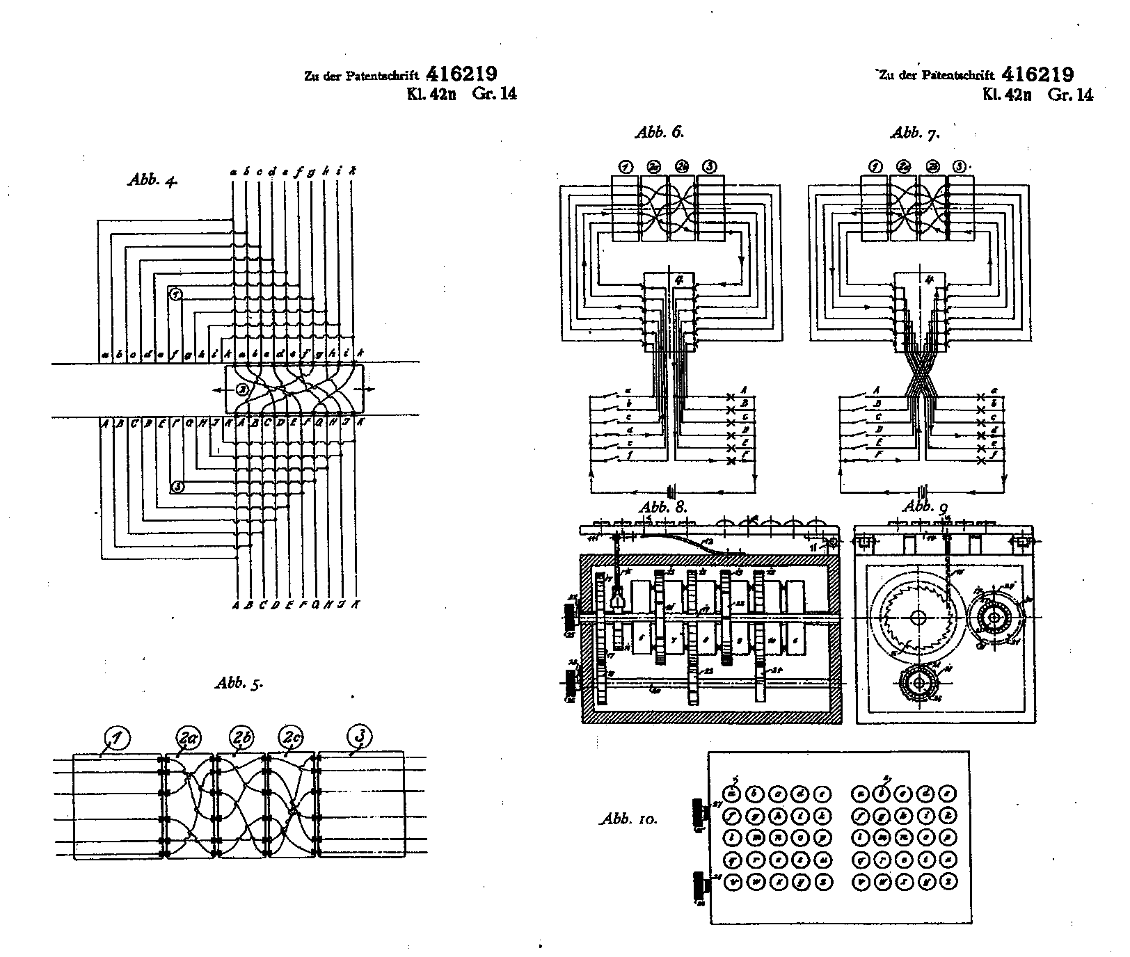 DE416219 Chiffrierapparat; Application date 28 February 1918, granted 8 July 1925; Applicant Gewerkschaft Securitas in Berlin; 1. claim: Chiffrierapparat, bei welchem zum Zwecke der Vertäuschung von Zeichen zwischen Zeichensender und Zeichenempfänger eine oder mehrere zwischen festen Endleitungsträgern mit Energieeintritts- und -austrittsstellen (Kontaktstellen) frei bewegliche Zwischenleitungsträger geschaltet sind, deren Energieeintrittsstellen und -austrittsstellen (Kontaktstellen) paarweise beliebig miteinander verbunden sind, dadurch gekennzeichnet, daß sich der oder die Zwischenleitungsträger (4 an 2, Abb 1 und 2) an den Reihen der festen Kontaktstellen (4 an I Abb. 1 und 2) derartig vortbewegen lassen, daß die Bewegung der Kontaktstellen in Richtung der Verbindungslinie dieser Kontaktstellen erfolgt. ... Very significant Enigma patent, which originate from the days of World War One!