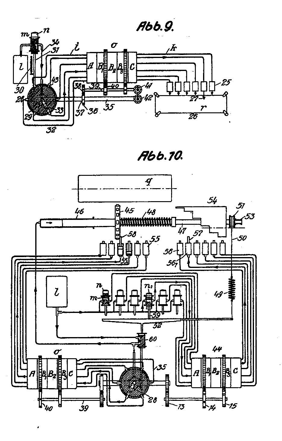 Keywords: Met de geheimschrijfmachine moet men een mededeling in gewoon schrift in zoo kort mogelijken tijd kunnen omzetten in een zoodanige reeks letters of tekens, dat het voor onbevoegden niet mogelijk is, daaruit weder de oorspronkelijke mededeeling af te leiden. Het op deze wijze verkregen geheimschrift moet weer snel en eenvoudig met dezelfde, of een overeenkomstige, machine in gewoon schrift kunnen worden omgezet. De eisch van onoplosbaarheid van het geheimschrift maakt het nodig, de machine op een groot aantal willekeurige wijzen te kunnen instellen en den sleutel gedurende het schrijven te kunnen veranderen, zoodat zelfs iemand die met de machine bekend is, noch door berekening, noch door proefnemingen of op andere wijze het geheimschrift kan oplossen. Het Oostenrijksch octrooi (= patent) No. 62926* beschrijft reeds een inrichting, bestaande uit twee electrisch gekoppelde schrijfmachines; een commutator, die in de geleidingen tusschen beide machines is geschakeld, dient hier het omzetten van de teekens. De commutator bestaat uit een vaste schijf, met volgens een cirkel gerangschikte contacten, aangesloten op de draden naar ééne machine, en uit een draaibare schijf met eveneens volgens een cirkel geschikte contacten, die aan de draden naar de andere machine ver bonden en ten opzichte van de contacten der eerste reeks kunnen worden ingesteld. Genoemd octrooischrift vermeldt tevens, dat men eenige van zulke paren schijven achter elkander kan schakelen om hierdoor tot samengestelde sleutels te geraken. Met behulp van een machine met maar slechts één commutator volgens de genoemde Oostenrijkse octrooischrift kan men geen geheimschrift samenstellen, hetwelk niet door een eenigszins geschoold vakman zou kunnen worden opgelost. Dit is bij juist gebruik het geval, wanneer men twee commutators achter elkander schakelt; men heeft dan echter twee onafhankelijk van elkaar beweegbare schijven (= rotors, AOB), zoodat de geleidingen aan vormverandering (torsie) onderhevig zijn. Overeenkomstig de uitvinding nu vermijdt men dit nadeel in beginsel daardoor dat men de beide beweegbare schijven, die volgens genoemd octrooischrift achter elkander zijn geschakeld, tot één tusschenstuk vereenigt. Een volledige kenschets van de nieuwe machine is dus, dat in de geleidingen voor het overbrengen van energie tusschen den teekenzender en den teekenontvanger een of meer tusschenstukken zijn geschakeld, waarin de plaatsen van toetreeding van energie (= point of input of a rotor, AOB) aan de eene zijde, en die van uittreeding van energie aan de andere zijde op onregelmatige wijze twee aan door geleidingen (internal wiring, AOB) zijn verbonden, waarbij de tusschenstukken zoodanig verschuifbaar zijn aangebracht, dat de plaatsen van toetreeding en die van uittreeding van energie zich in de richting van haar verbindingslijn verplaatsen. (strange way of explaining that the electrical current flows in a given direction, AOB) ......... ; Aan deze constructie zijn vele voordeelen verbonden. Het grootste voordeel bestaat daarin, dat het aantal sleutels willekeurig kan worden vergroot. ...; De gemakkelijke omschakelbaarheid is daarom van zooveel belang, dat men het samenstellen van een voor derden onoplosbaar geheimschrift, den sleutel gedurende het samenstellen van het geheimschrift zeer dikwijls, liefst na het schrijven van elk afzonderlijke letter moet veranderen. Een zeer belangrijk voordeel van de veelwegklep is verder nog, behalve het buitengewoon groote aantal sleutels in elke machine, dat de machine zelve op tal van verschillende wijzen kunnen zijn geconstrueerd. Zelfs wanneer men uitsluitend machines vervaardigt met dezelfde aandrijfrichting van de veelweg kleppen, zou men reeds een enorm groote verscheidenheid verkrijgen door de afzonderlijke buizen op verschillende wijzen op de tussenstukken aan te sluiten. Verschilt echter slechts één enkele rol der ene machine van die eener andere machine, dan is ontcijfering door derden volkomen onmogelijk. Er worde nadrukkelijk op gewezen, dat de beschreven inrichtingen slechts als voorbeelden zijn te beschouwen. Het is voor het principe van de uitvinding van geen belang, welk medium door de buizen stroomt, of dit lucht, water, olie of derg. is. Ook is het niet noodzakelijk buizen toe te passen. De overdracht van energie kan ook b.v. langs zuiver mechanischen weg door behoorlijk geleide staaldraden, door hefboomen of electrische geleidingen, of wel door lichtstalen plaats vinden, waarbij natuurlijk de cylinders met zuigers moeten worden vervangen door andere zend- en ontvangorganen, overeenkomstig den aard van het medium. Om deze reden zijn de energiewegen in de figuren 3-5 niet als buizen afgebeeld, doch met enkele lijnen aangeduid (as is practized when electrical wiring is concerned, AOB). ... ; De wielen 14, 15, 20 en 21 zijn voorzien van tanden op de wielen kunnen verschillend, en de verdeeling van de tanden langs de omtrek kan willekeurig zijn. De tusschenstukken 66 to 69 zijn alle op een as draaibaar aangebracht en van tandkranschen 24 voorzien. Door de tanden worden de tusschenstukken gedraaid. De beschreven wijze van aandrijven bezit groote voordelen. Ten eerste wordt de ontcijfering van het geheimschrift voor onbevoegden door de onregelmatige wijze van overbrenging aanmerkelijk bemoeilijkt. Door het toepassen van twee drijfassen (13 en 19) met verschillende aantallen omwentelingen wordt de periode, na afloop waarvan men weer denzelfden sleutel bereikt, aanmerkelijk verlengd, zoodat ook bij een lang bericht dezelfde sleutel niet meer dan eens wordt gebruikt. .... ; Voor het wezen van de uitvinding is het slechs van het volgende van belang: de aandrijving moet zoodanig zijn, dat zij op verlerlei wijze kan worden gewijzigd, en dat het in cijferschrift overbrengen van een zeer groot aantal tekens noodig is, om weer tot den oorspronkelijken sleutel terug te komen. .... ; Het omzetten van gewoon schrift in geheimschrift vindt nu als volgt plaats. Men drukt op ee