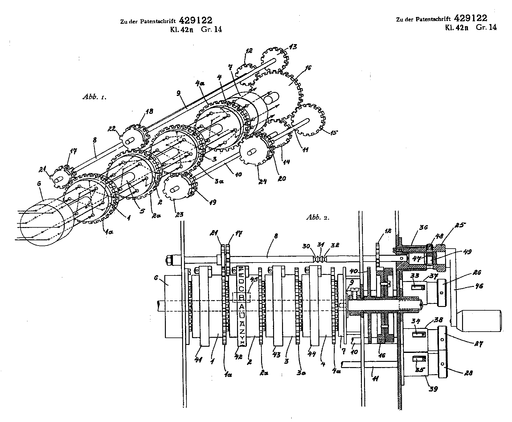 DE429122 Chiffriermaschine mit einer Mehrzahl von die Vertauschung der Zeichen bewirkenden Chiffrierwalzen; Application date 26 March 1924, granted 21 May 1926; Applicant: Chiffriermaschinen Aktiengesellschaft in Berlin; Inventor Paul Bernstein; 1. claim: Chiffriermaschine mit einer Mehrzahl von die Vertauschung der Zeichen wirkenden Chiffrierwalzen, dadurch gekennzeichnet, daß die den Antrieb der Chiffrierwalzen zur Änderung des vertauschungssystems bewirkenden Zahnräder Teilung nach Primzahlen oder ohne einen gemeinsamen Faktor besitzen. ... This patent definitely belongs to their type-writer apparatus. (Regard also: ETZ 1923 on Arthur Scherbius' article)
