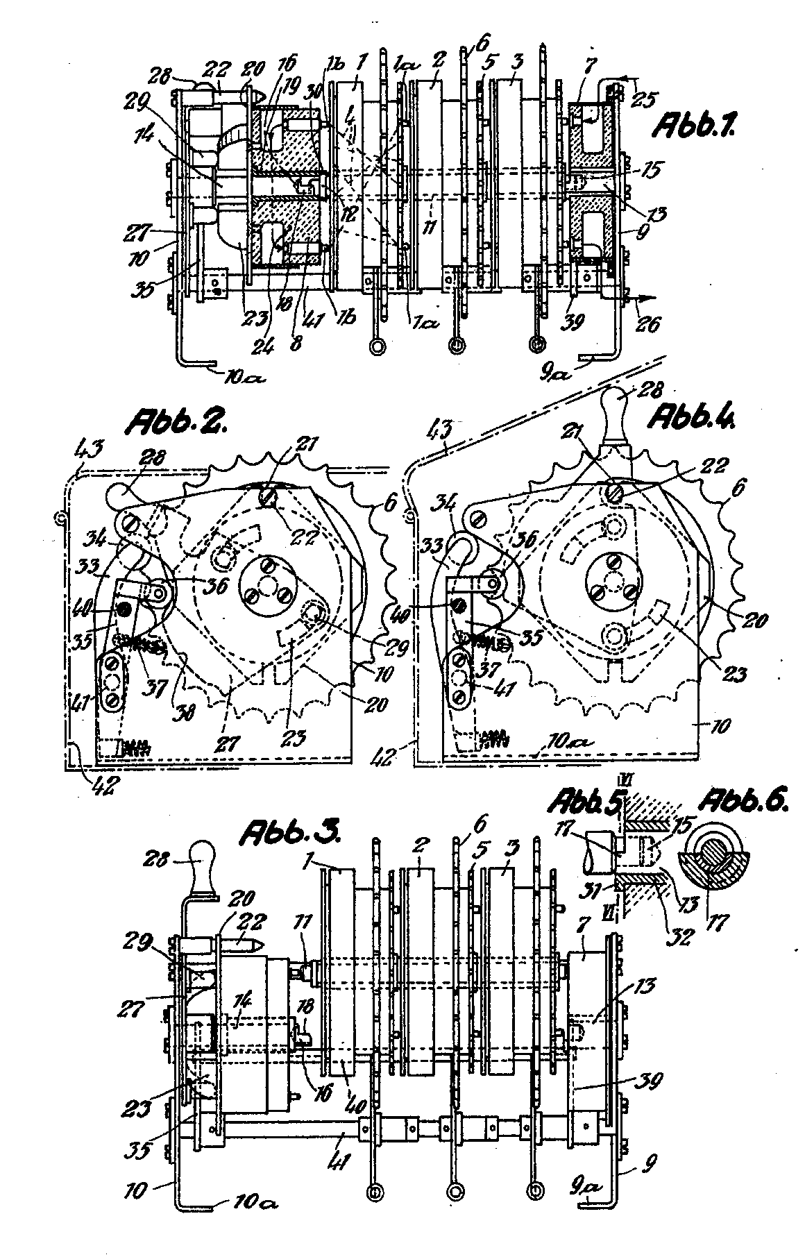 Drawing to DE460457. Spindle number 11 is the central shaft which carries the rotating Enigma rotors. The trick was, that handle '28' is to be set as to release shaft (spindle) '11'.
