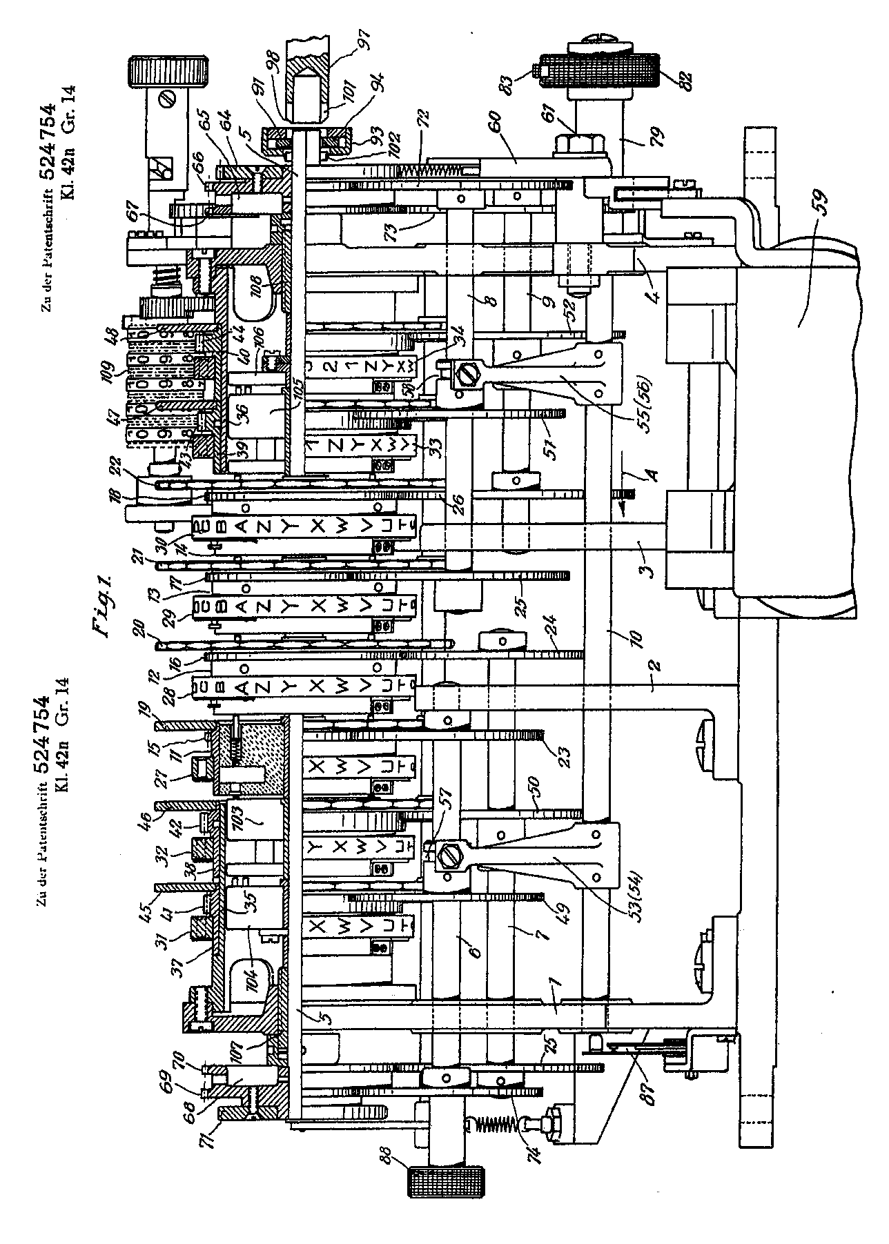 DE524754 Chiffriervorrichtung für elektrische Chiffrier- und Dechiffriermaschinen; Application date 30 January 1929, granted 15 may 1931; Applicant: Chiffriermaschinen Akt. -Ges. in Berlin; Inventor Willi Korn; 1. claim: Chiffriervorrichtung für elektrische Chiffrier- und Dechiffriermaschinen mit Chiffrierwalzen, welche durch Lückenzahnräder angetrieben werden und Schlüsselzeichen zur Kenntlichmachung der Stellung sowohl für die Chiffrierwalzen als auch für die Lückenzahnräder aufweisen, und bei denen die Schlüsselzeichen für die Chiffrierwalzen in der Reihe nebeneinander, z.B. auf gleichachsigen, drehbaren Ringen angeordnet sind, dadurch gekennzeichnet, daß die Schlüsselzeichen für die Lückenzahnräder in derselben Reihe wie die für die Chiffrierwalzen, z.B. auf mit den letzteren gleichachsigen, drehbaren Ringen, angeordnet sind. This is a very significant patent, as it deals with the so-called 'Ringstellung'. The Enigma rotors carried alphabetic sequense and/or numbers. The relative position of characters versus the position upon the rotor, increases the coding possibilities enormously! The drawing below shows that this invention was meant for the secret type-writer (geheimschreibende Schreibmaschine). Regard also: ETZ 1923 on Arthur Scherbius' article)