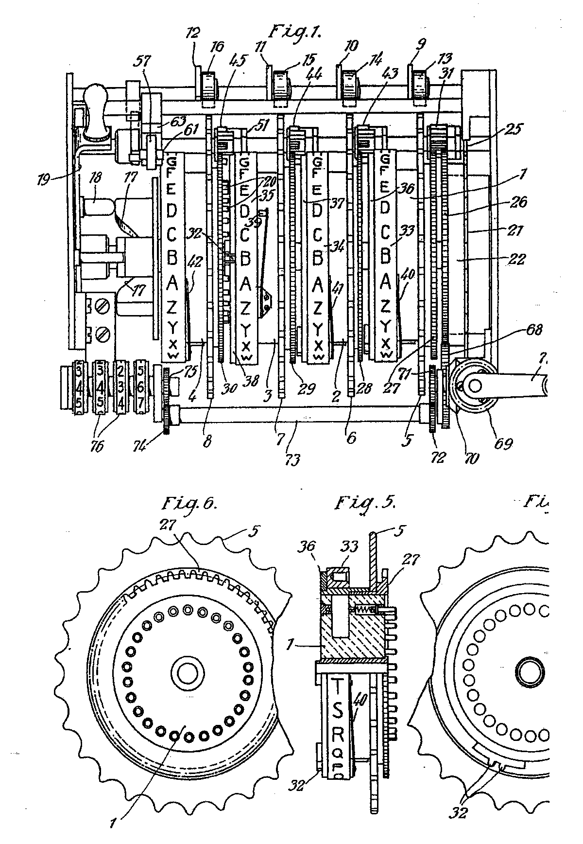DE554421 Elektrische Chiffriervorrichtung; Application date 31 January 1928, granted 8 July 1932; Applicant: Chiffriermaschinen Akt.-Ges. in Berlin; 1. claim: Elektrische Chiffriervorrichtung mit die Vertauschung der Zeichen zwangsläufig bewirkenden, während des Chiffrierens gegeneinander bewegten Chiffrierkörpern, z.B. walzenförmiger Gestalt, mit einer Vielzahl von Kontaktstellen auf den Stirnseiten der Walzenkörper sowie Zeichengebern und Zeichenanzeigern, dadurch gekennzeichnet, daß zwischen den bewegten Chiffrierkörpern während des Chiffriervorganges in Ruhe befindliche Körper angeordnet sind mit der gleichen Anzahl Kontaktstellen und gleicher Teilung wie die beweglichen Chiffrierkörpe, und daß ferner die Zwischenverbindungen der Kontaktstellen an beiden Seiten der festen Chiffrierkörper willkürlich änderbar sind.