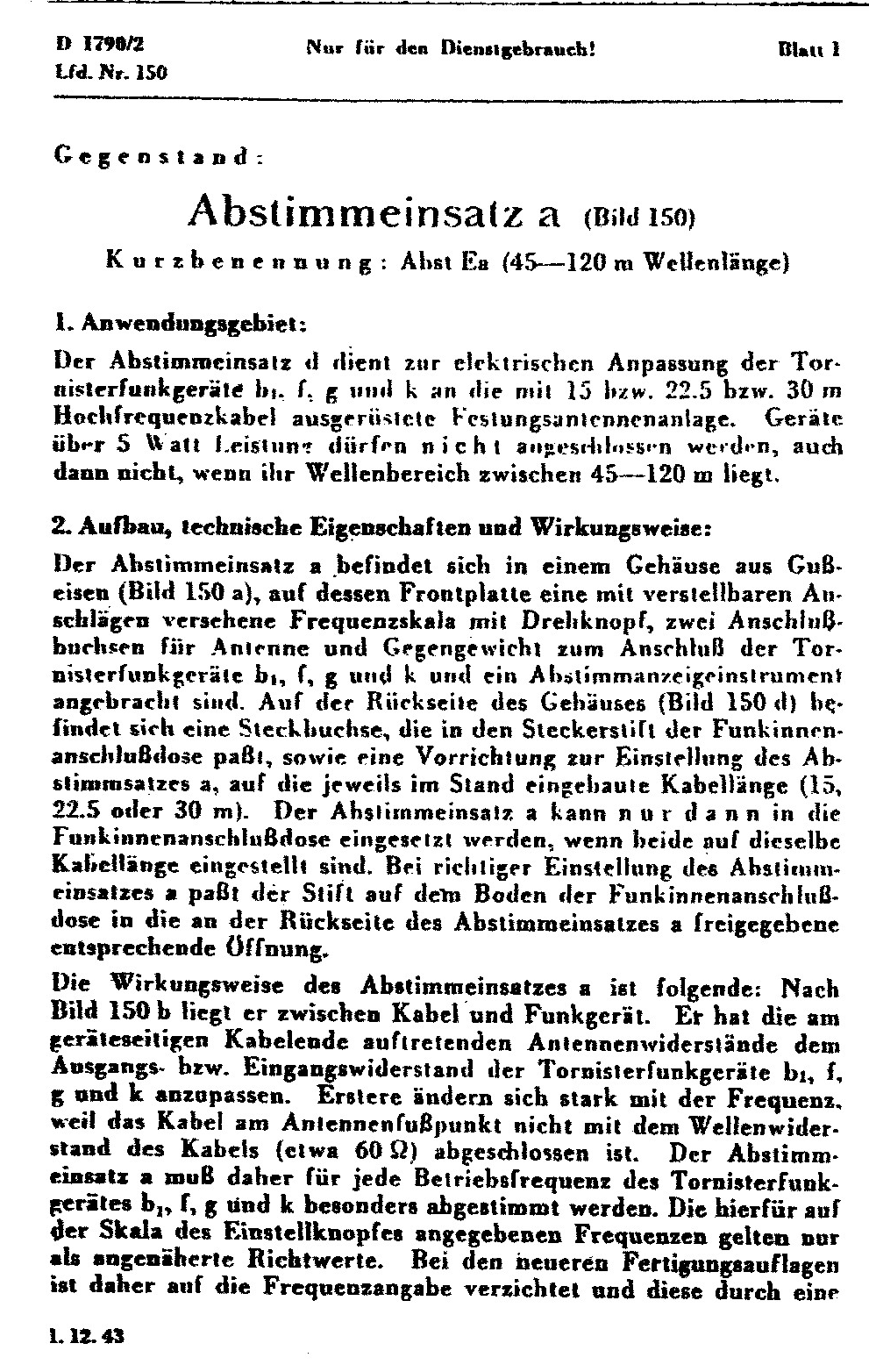 To match the Torn Fu b1 or f antenna onto a special bunker-antenna-arrangement. In this case special antenna circuit tuning was necessary. The Absatz a apparatus allows control of the transmitted power into the bunker antenna. On 14-15