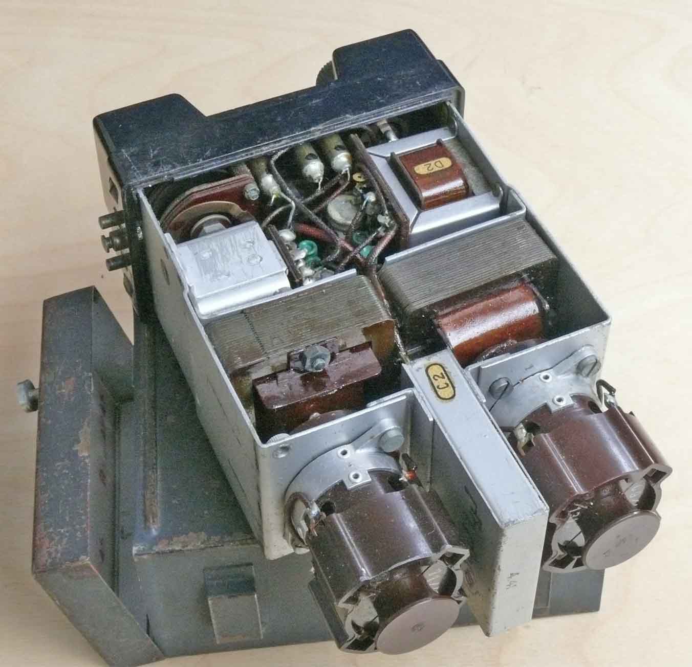 Its function is that the phase of the DF loop and the audio output is being switch synchronously. This makes it possible to indicate whether a radio beacon is left or right of the virtual antenna direction. The auto-DF-mode is designed as to tune at signal minimum. Please notice the HF pot-core, these cores where later well known in ferrite cores. This type is, however, made of dust core.