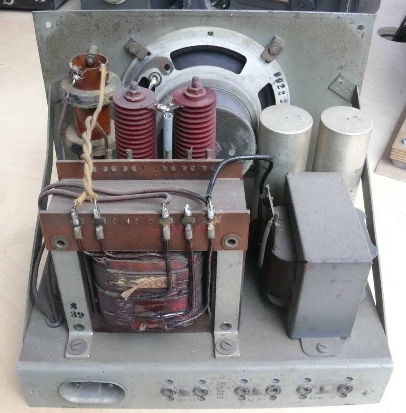 Upper left-hand side, the typical Lorenz type tone frequency coils are clearly visible. These are also tuneable. In the background the service mode switch: Betrieb - Eichen (operate - Calibrate) The valve is type RE134, well known in those days