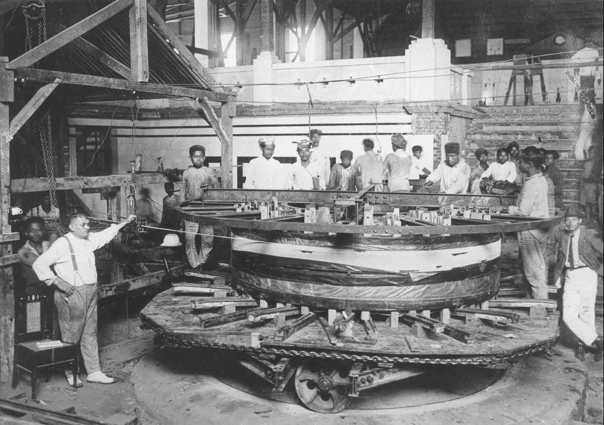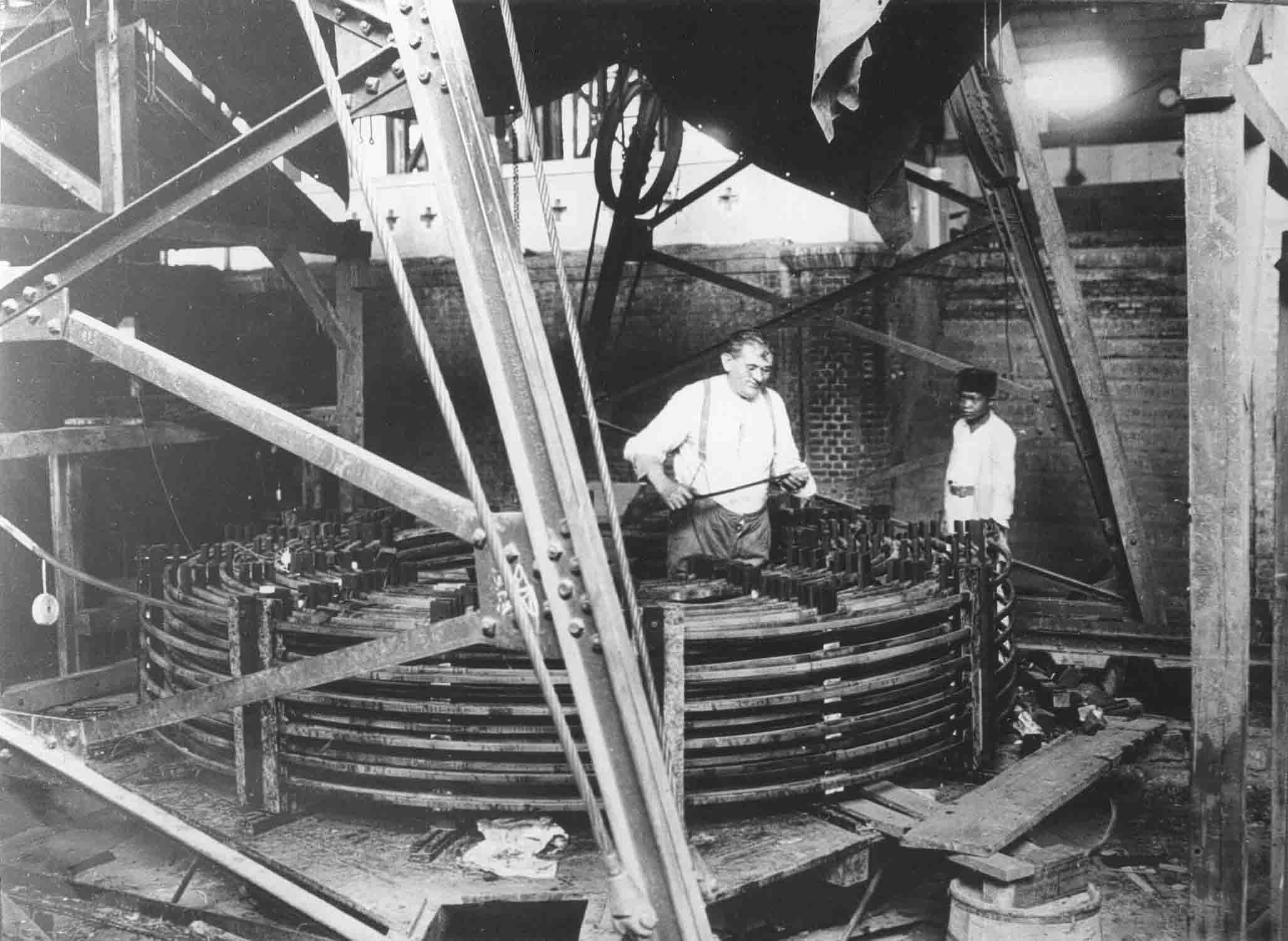 Het complete magneetgestel van de 2400 kW booglampzender. De onderste magnetiseringsspoel is reeds aangebracht en bevindt zich in de tank, welke met olie wordt gekoeld. Het wachten is op de bovenste bekrachtigingsspoel. Opname: 7/2/1922