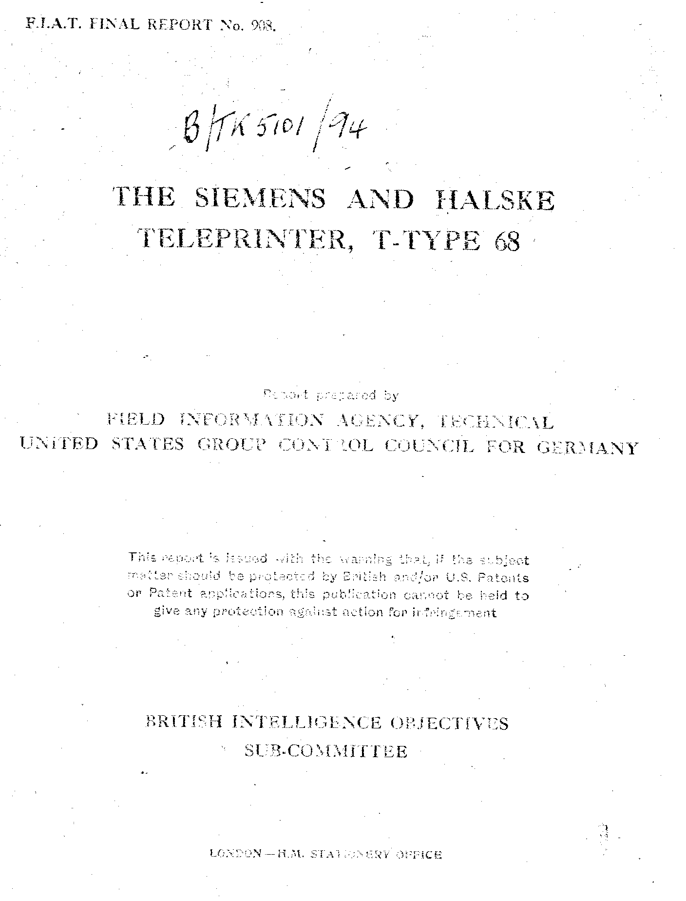 Keywords: Telex; S&H T 68; Evaluation: The design is radically different from the types previously manufactured, and although not in the production stage before the conclusion of hostilities, test of the models available and the capabilities of the engineers concerned in the design show that definite improvements have been effected ... ; The design, commenced about five years ago, was intended to provide the Wehrmacht with a machine requiring minimum maintenance, ligt in weight, and exceptional robust. It is in many respects radically different from the patterns previously manufactured by Siemens and Halske (and elsewhere, AOB). It is very compact and although the design influenced by Service requirements the possibility of applying the machine commercial use has been retained. The War finished before the production stage was reached. Fifteen samples were made and twelve of these were delivered to the Wehrmacht. The remaining three are in the possession of the firm, two at berlin and one at Munich .....