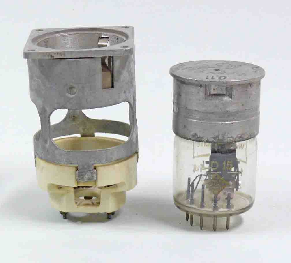 The valve (tube) height can be adjusted for various valve types. What was changed (adjusted) was the extender between the main holder and ceramic socket plate. Please notice the off-setting of the anode pins, which allowed minimal coupling between in- and output. This is very significant, as the bandwidth of a valve stage is determined by the ratio between Cag and S (= g mutual conductance). A closed top-lid of this valve base secured that even under heavy shock conditions the valve was locked-up safely in it.