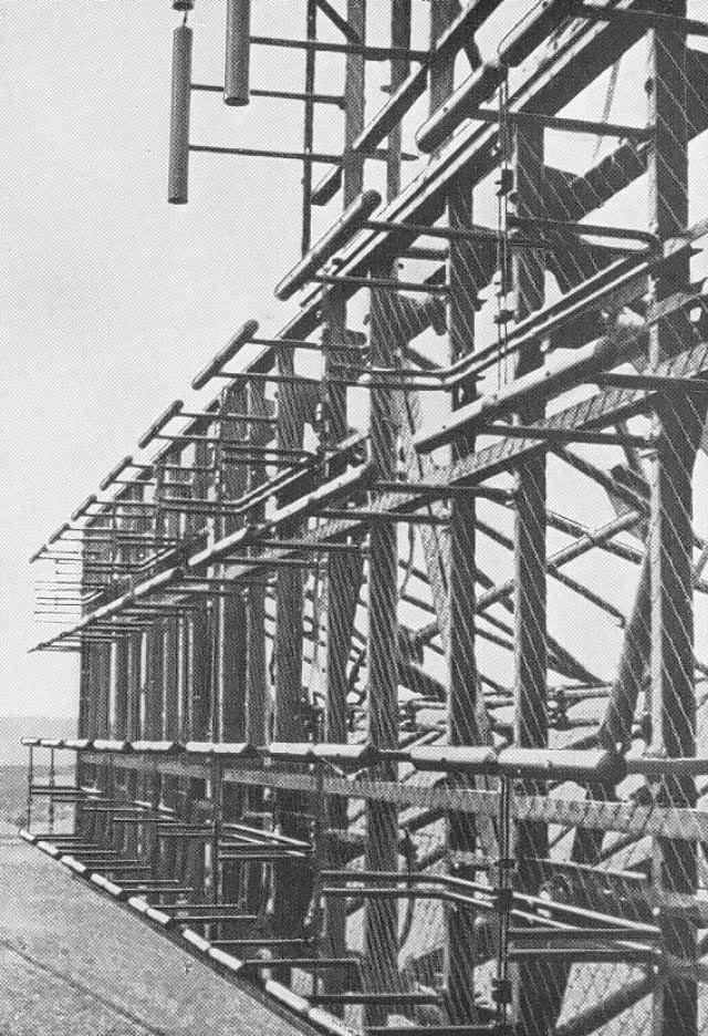 Half section of the Jagdschloss antenna array. Its antenna field is horizontally polarized, whereas the vertical radiators in the upper section belong to the IFF system