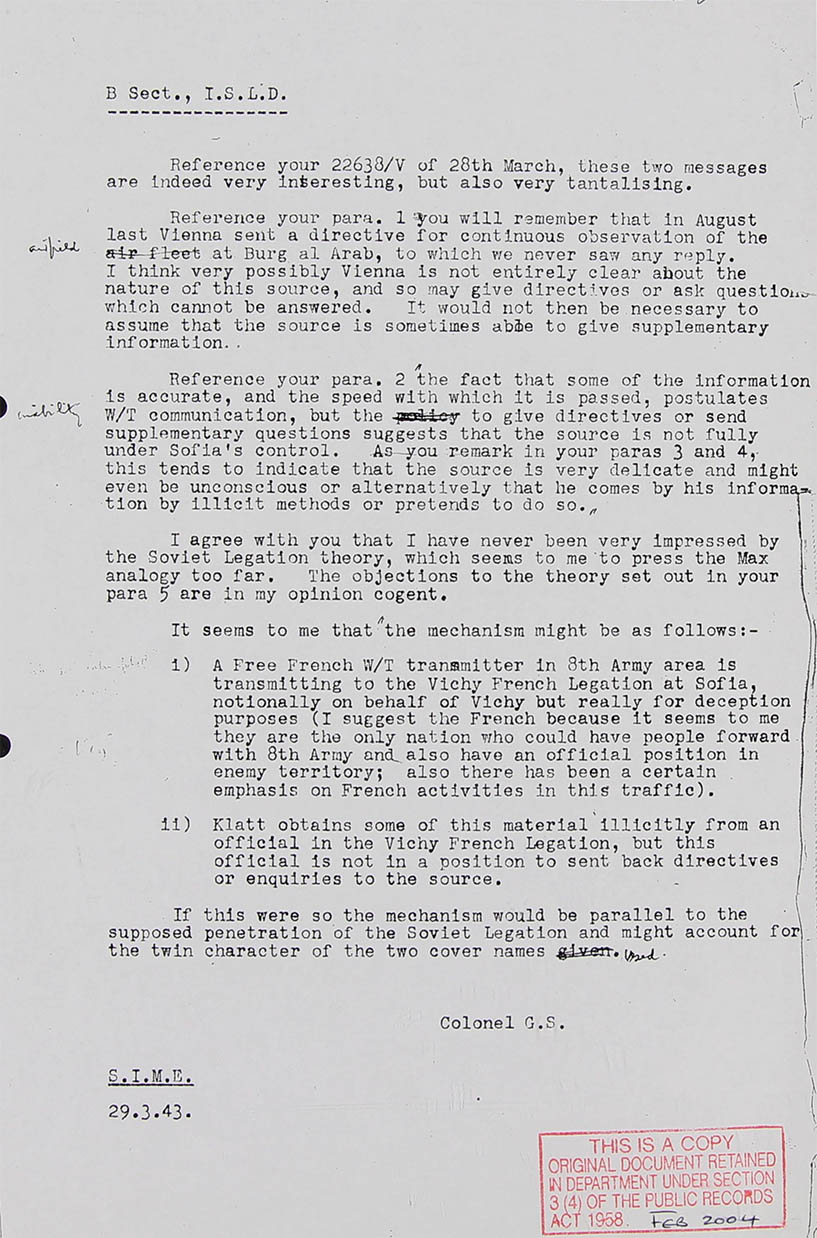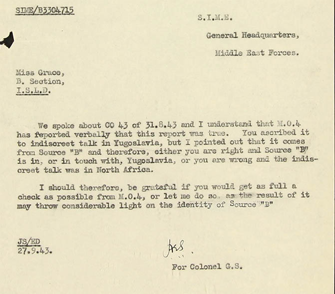 We spoke about CQ 43 of 31.8.43 and I understand that M.O.4 has reported verbally that this report was true. You ascribed it to indiscreet talk in Yugoslavia (AOB: the essence is - that the British intercepted Klatt messages which content was too often true or nearly relevant. In this context they were trying to imagine as to how the Germans caught such information, as in someway or another, there must exist a leakage. This is what KV 2/1499 series is mainly about) You ascribed it to indiscreet talk in Yugoslavia, but I pointed out that it comes from source "B" and therefore, either you are right and Source "B" is in, or in touch with, Yugoslavia, or you are wrong and the indiscreet talk was in North Africa.
