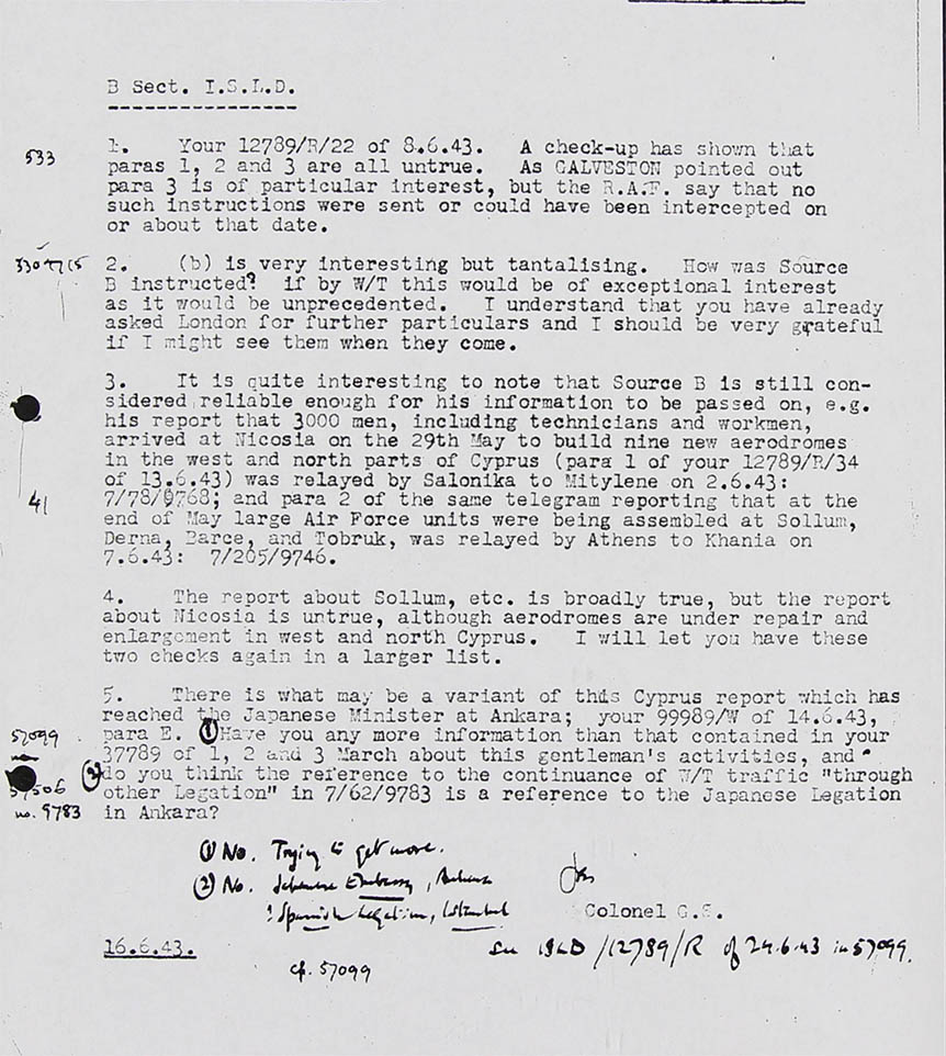 3. It is quite interesting to note that Source B is still considered reliable enough for his information to be passed on, e.g. his report that 3000 men, including technicians and workmen, arrived at Nicosia on the 29th May (1943) to build nine new aerodromes in the west and north parts of Cyprus (paragraph 1 of your CX 12789/R?34 of 13.6.43) was relayed by Salonika to Mytylene on 2.6.43:→
