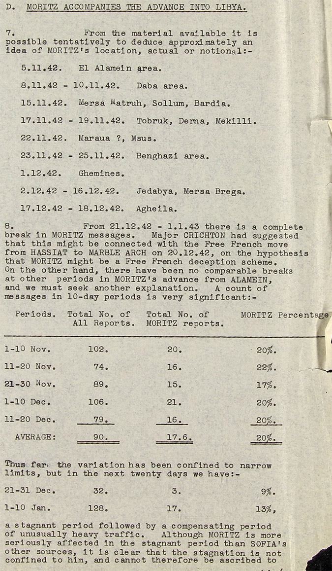 10. While veracity checks indicate that much of what Moritz and Ibis report is entirely or substantially false, they also indicate that some items are true, and some of these important. Some of the true reports could hardly have been based on guesswork or on hearsay from a distance. So Moritz at least must be present in the localities from which his veracious reports appear to hail (flood). If so, Moritz must have advanced with the 8th Army and must have been for some time in the recent past at or near Medenine (Tunisia).