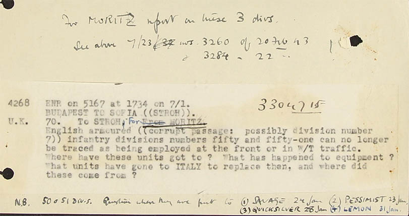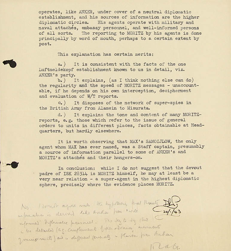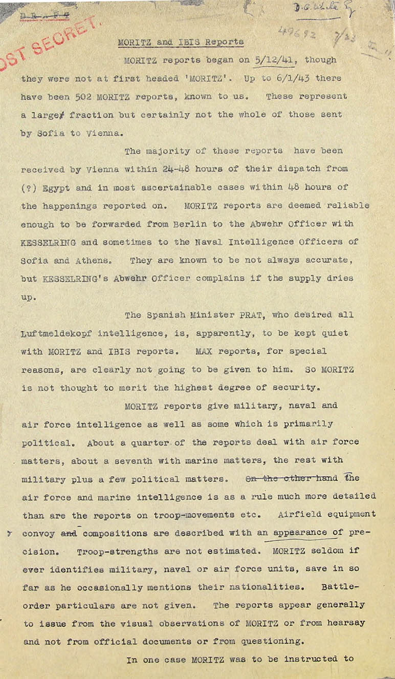 Note: It has been suggested that Moritz and Ibis are Russian double-crossers. The point is of very slight importance for any case they represent a grandiose leakage of information or misinformation uncontrolled by us, using a communication-method, appreciated by the Germans but completely undetected by us. Our security-system has been trickled for a year and a quarter, and the hypothesis that its motives are anti-German brings little reassurance.