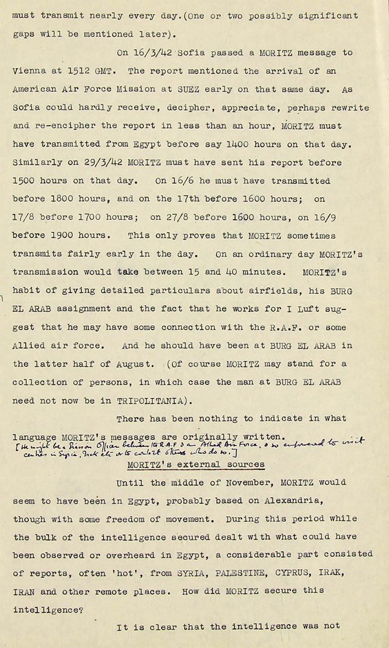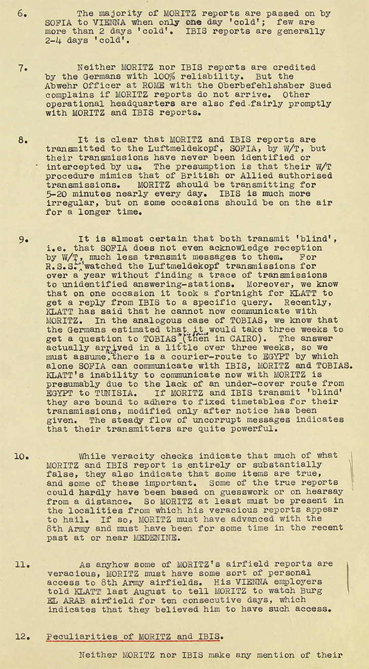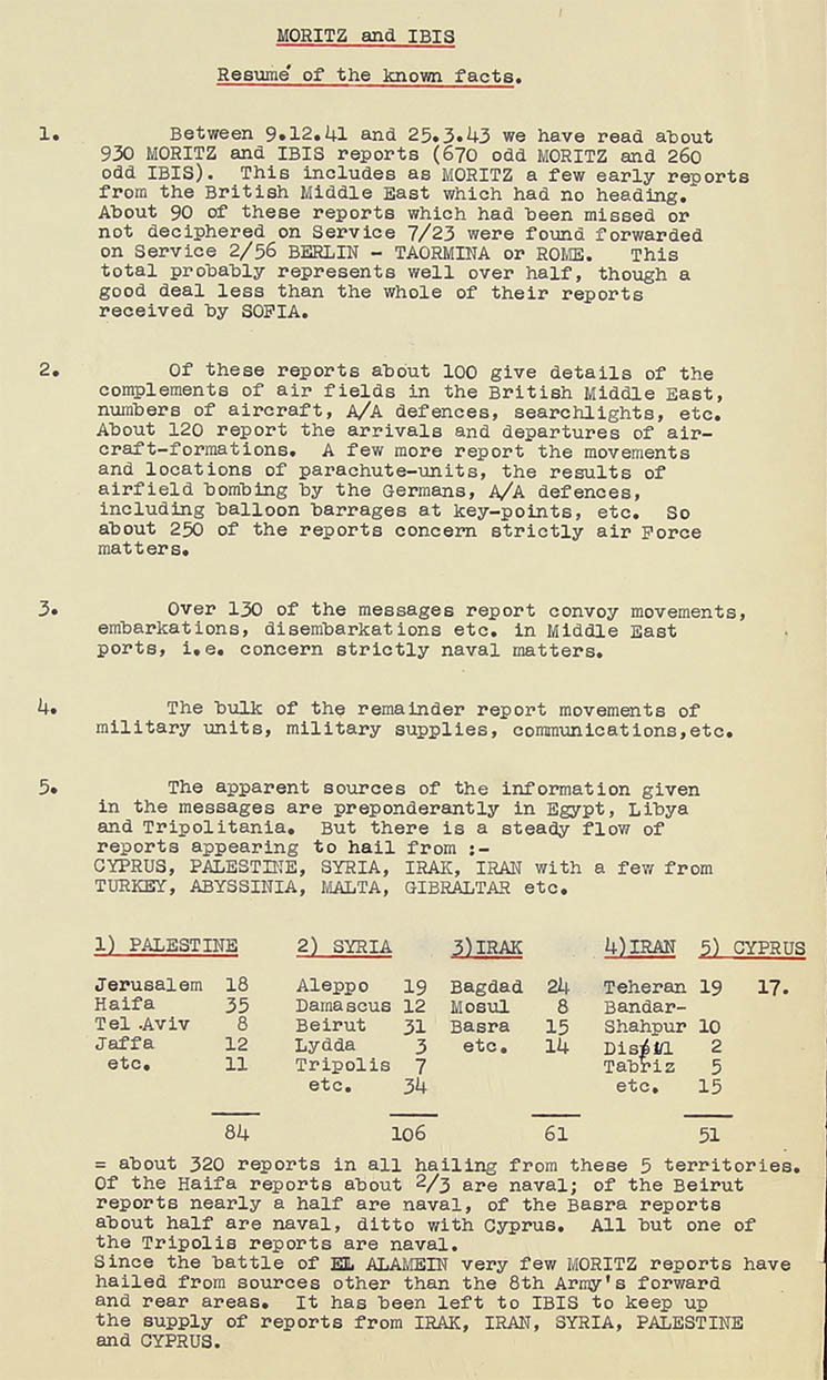 14. Moritz and Ibis seem to have the same sources for their intelligence from Syria, Palestine, Irak, Iran (Persia) and Cyprus. Their style of reporting is identical, one or two of their spelling errors are identical, and on one or two occasions their reports deal with the same topic, but their activities appear to be independent. Ibis seems to have remained in Egypt, while Moritz has moved west as far as the Mareth line (Southern Tunisia). Moritz seems to keep in W/T touch with Egypt, and on rare occasions he still reports on happenings in the Levant. There is nothing to show how Moritz and Ibis are fed with 'hot' intelligence from Haifa, Beirut, Jaffa, Teheran, Bandar Shahpur, Bagdad, Mosul or Cyprus.