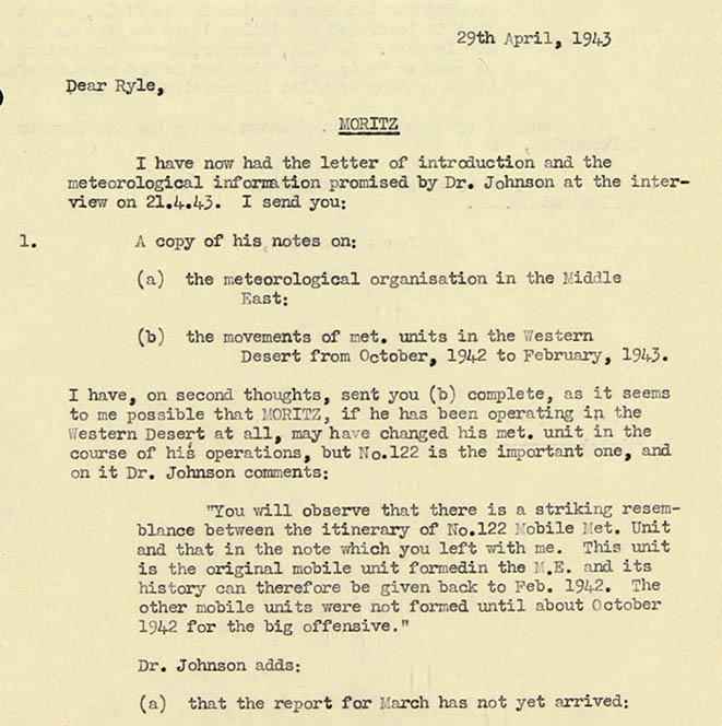 13. Moritz and Ibis are very reluctant to mention the numbers or names of military units of Air Force units or of ships. Recently Moritz and Ibis have begun to mention now and again Division numbers and sometimes Brigade numbers. Aircraft types are hardly ever specified. Moritz once mentioned Wellingtons and in one report he spoke of Fortresses, Lancasters, Bostons and Stirlings. He has never mentioned Spitfires, Hurricanes, Blenheims, etc. at all. So his airfield inventories, though precise about numbers are extremely indefinite about the types of the aircraft. Apart from Generals and one or two statesmen, no individuals are ever named. Nor does Moritz ever describe particular air operations or losses suffered or inflicted in them. There seems no good reason why Moritz should be at once so informative and so uninformative. On the other hand, he is generally very precise about place-names and locations.