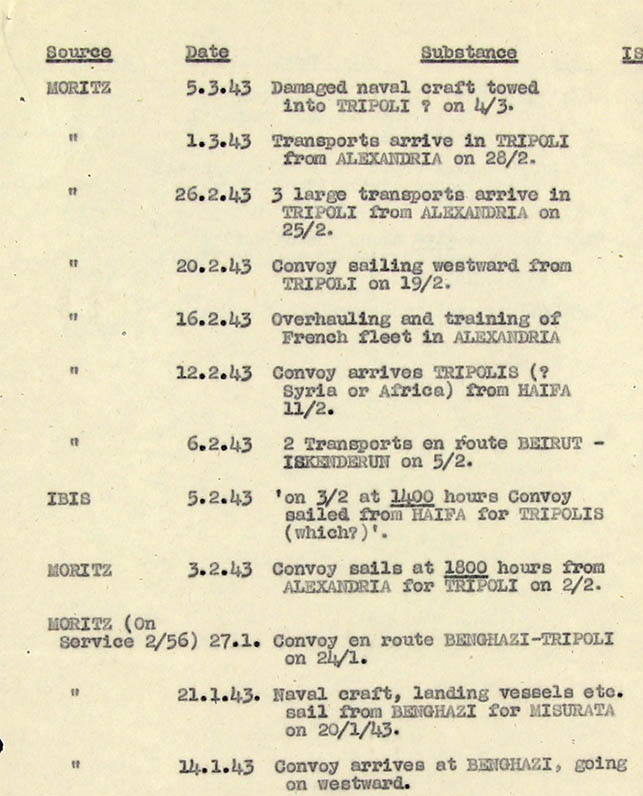 On the 3rd of January 1943 both Ibis and Moritz forwarded reports, both of 31/12/42 about a force moving from Lake Chad into South Libya. Ibis said that they were S. African brigades; Moritz gave more details about the force, especially its air complement, but did not say that the brigades were South African. This case strongly suggests that Ibis and Moritz had on this occasion a common source for their intelligence (Isos 49080 and 49200 of 3/1/43).