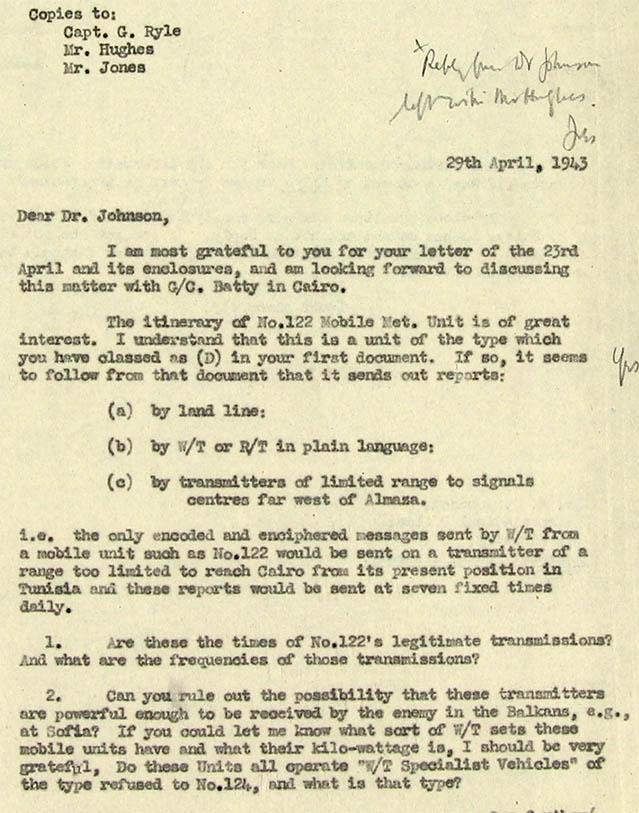 6. In short I do not think these messages have helped us very much and I only wish we could see the letters referred to, which might have helped a lot. I should be very interested to hear whether you consider any deductions are possible.