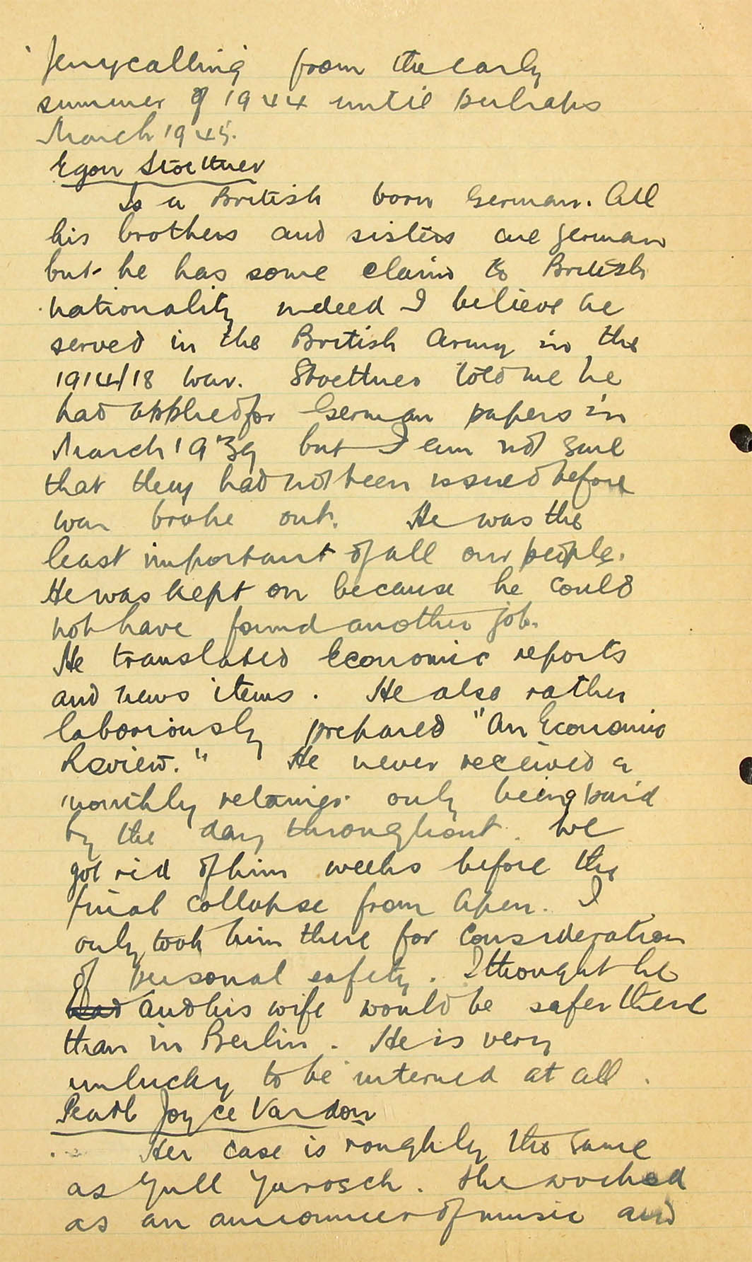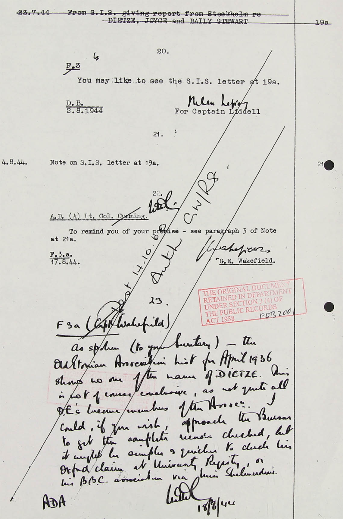 23.7.44. From S.I.S. (AOB: Secret Intelligence Service, later M.I.6) giving report from Stockholm re Dietze, Joyce (KV 2/245 ... KV 2/250; PF 44469) and Bally Stewart 19a