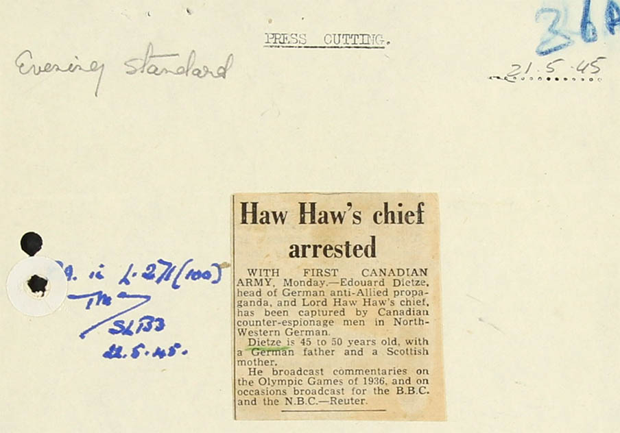 Details - Dietze is bilingual, being the son of a German father and a Scottish mother. He has lived in Germany for a considerable time and was one of the star commentators for the German Broadcasting Organisation particularly on spotting events. Before the war he used to visit the U.K. and broadcast in German and English for the Overseas transmissions. During the war Dietze became Controller of the English Section of the German Radio in Berlin and alternated with "Haw-Haw" (William Joyce) in news broadcasts to the U.K. He has recently been released from military custody in Germany.