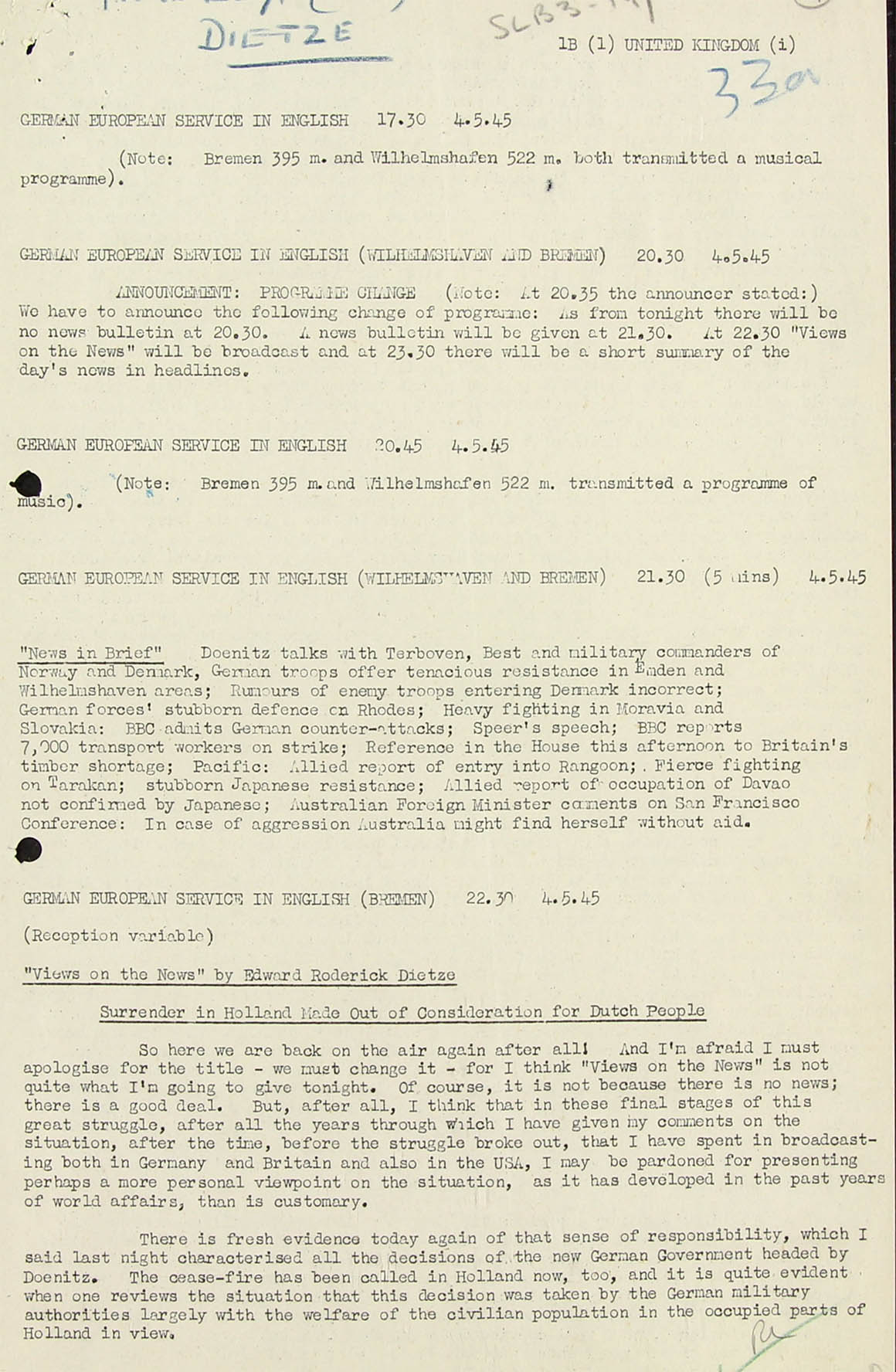 4.5.45. Broadcast talk by Dietze 33a. (AOB: which German transmitter was still operating, was it Wilhelmshaven? As Hamburg fell already in British hands and Berlin was concurred by the Russians.)