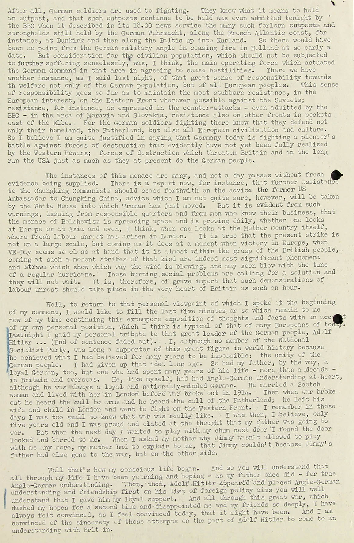 Well that's how my conscious life began. And so you will understand that all through my life I have been yearning and hoping - as my father once did - for true Anglo-German understanding. When, then, Adolf Hitler appeared and placed Anglo-German understanding and friendship first on his list of foreign policy aims u=you will well understand that I gave him a loyal support. And all through this great war, which dashed my hopes for a second time and disappointed me and my friend so deeply, I have always felt convinced, as I feel convinced today, that it might have been. And I am convinced of the sincerity of these attempts on the part of A.H. to come to an understanding with Britain.
