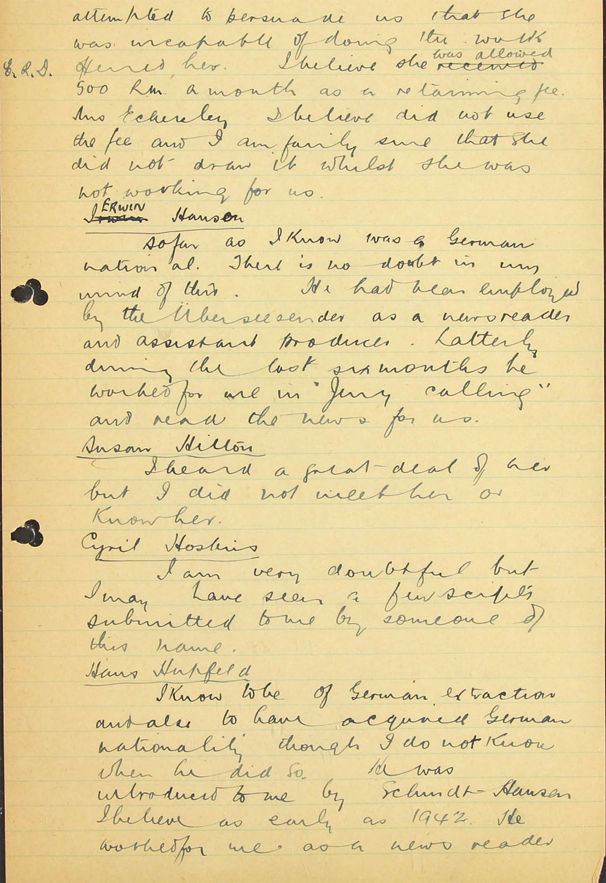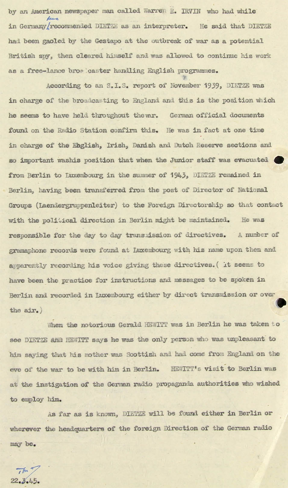 by an American newspaper man called Warren E. Irvin who had while in Germany has recommended Dietze as an interpreter. He said that Dietze had been gaoled by the Gestapo at the outbreak of war as a potential British spy, then cleared himself and was allowed to continue his work as a free-lance broadcaster handling English programmes.