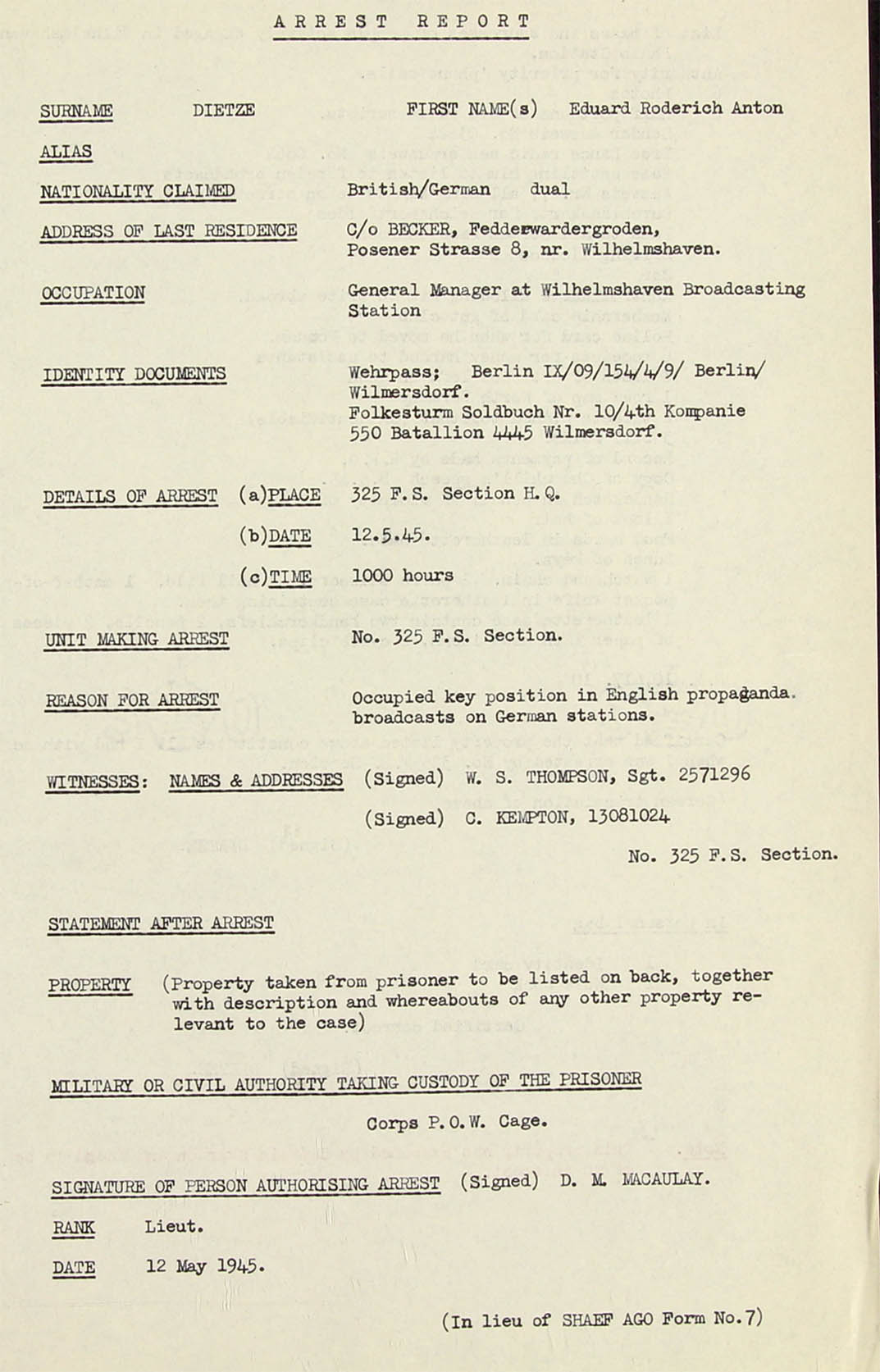 Witness: Names&Adress. (Signed) W.S. Thompson, Sgt. 2571296